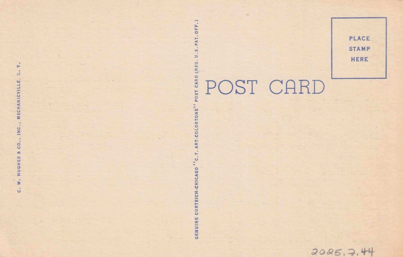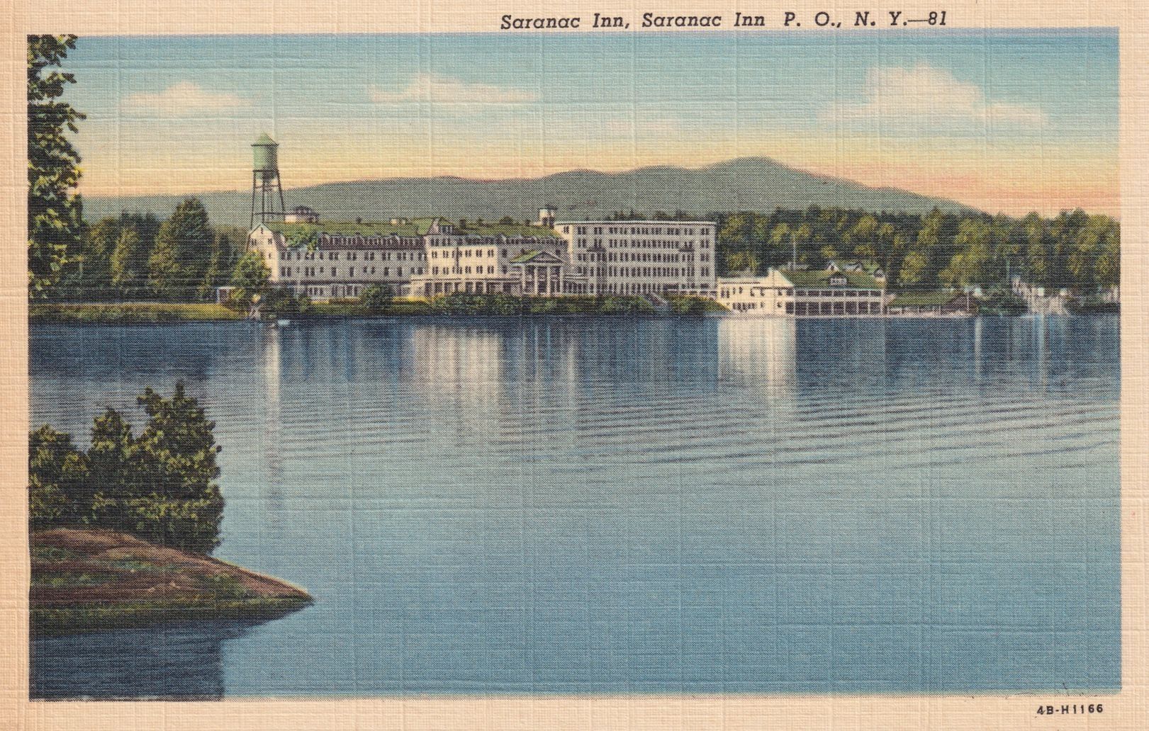 Color linen postcard showing a view of Saranac Inn from the water. Printed caption on front reads, "Saranac Inn, Saranac Inn P. O., N. Y." Printed by C. W. Hughes & Co., Ltd., Mechanicville, NY. Unused, divided back, white border.Subject Place