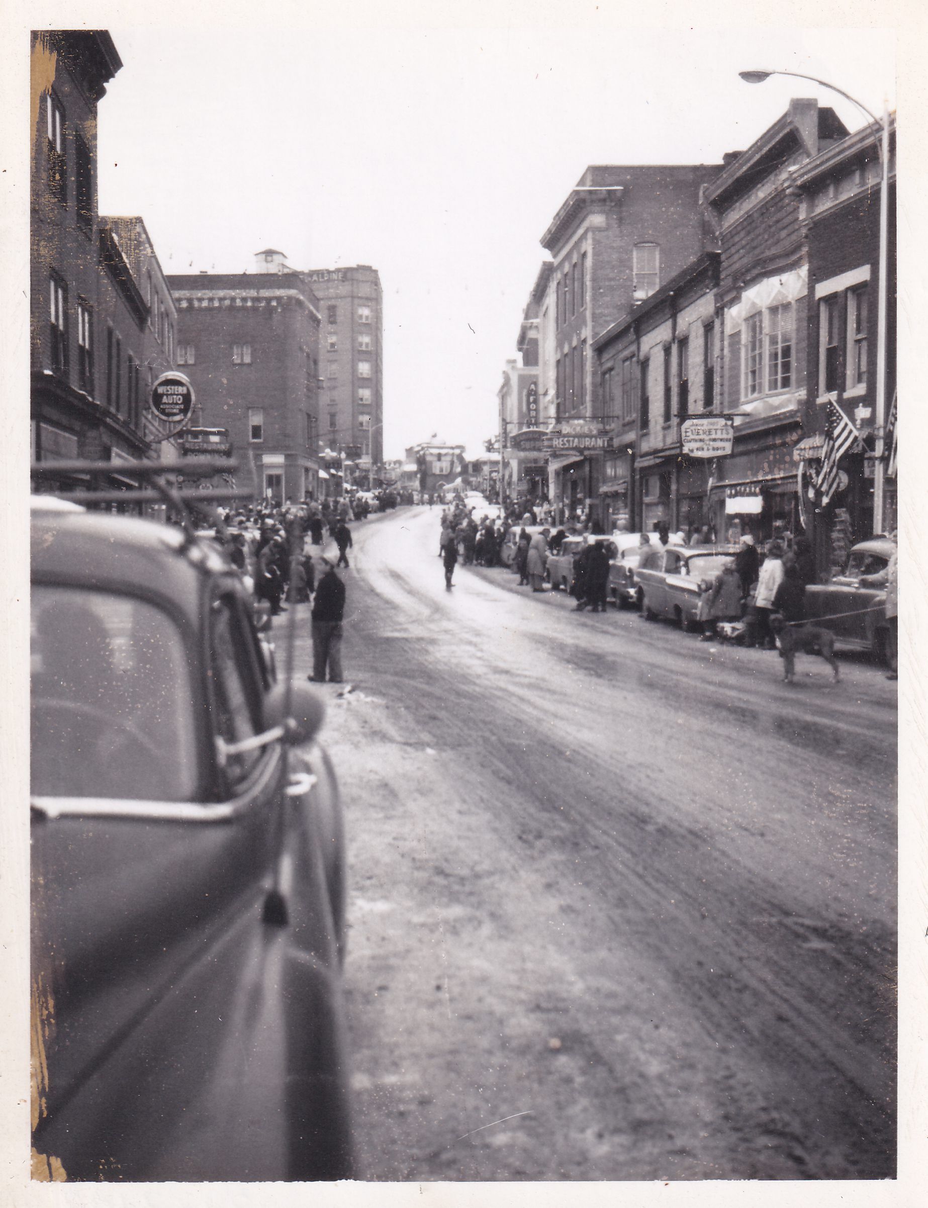 Photograph showing Broadway before or after the the Winter Carnival parade. The street is empty, but people can be seen standing along the sidewalks and edge of the road. The Masonic Temple and Alpine Hotel are visible, as are signs for Western Auto, A. Fortune Hardware, Dickie's Restaurant, and Everett's Clothing.Photograph Details