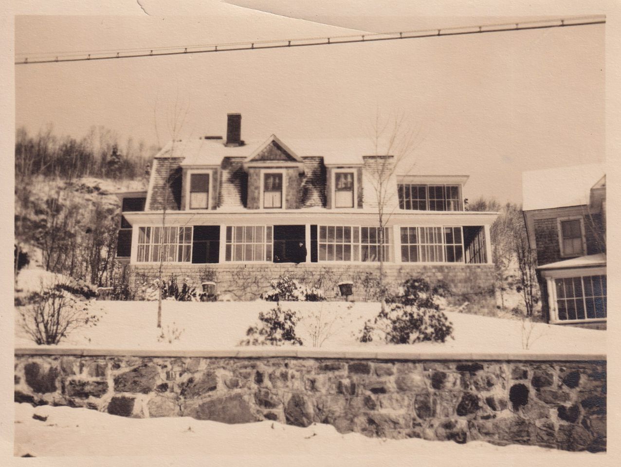 Black-and-White photograph of an unidentified cure cottage. A person is sitting in one of the open windows, and a stone wall can be seen at the edge of the yard. The photograph was likely printed by Kollecker's Kodak and Gift Shop.Collection