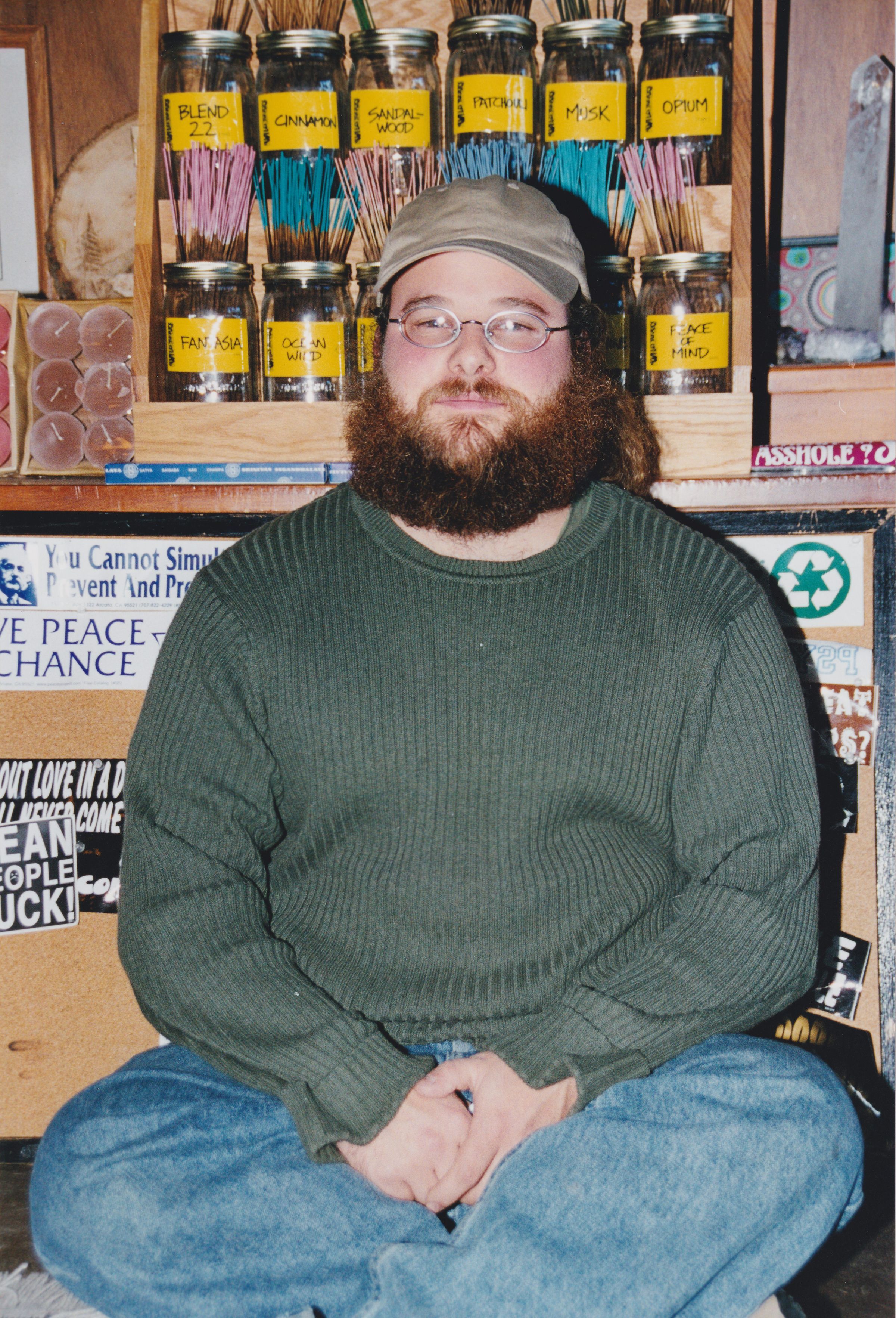 Color photograph of Kevin Templin in front of a wall of incense inside of his business, Peace of Mind. Portrait taken by Mary Lou Hanpeter Banks as part of her Soul Proprietor exhibition.