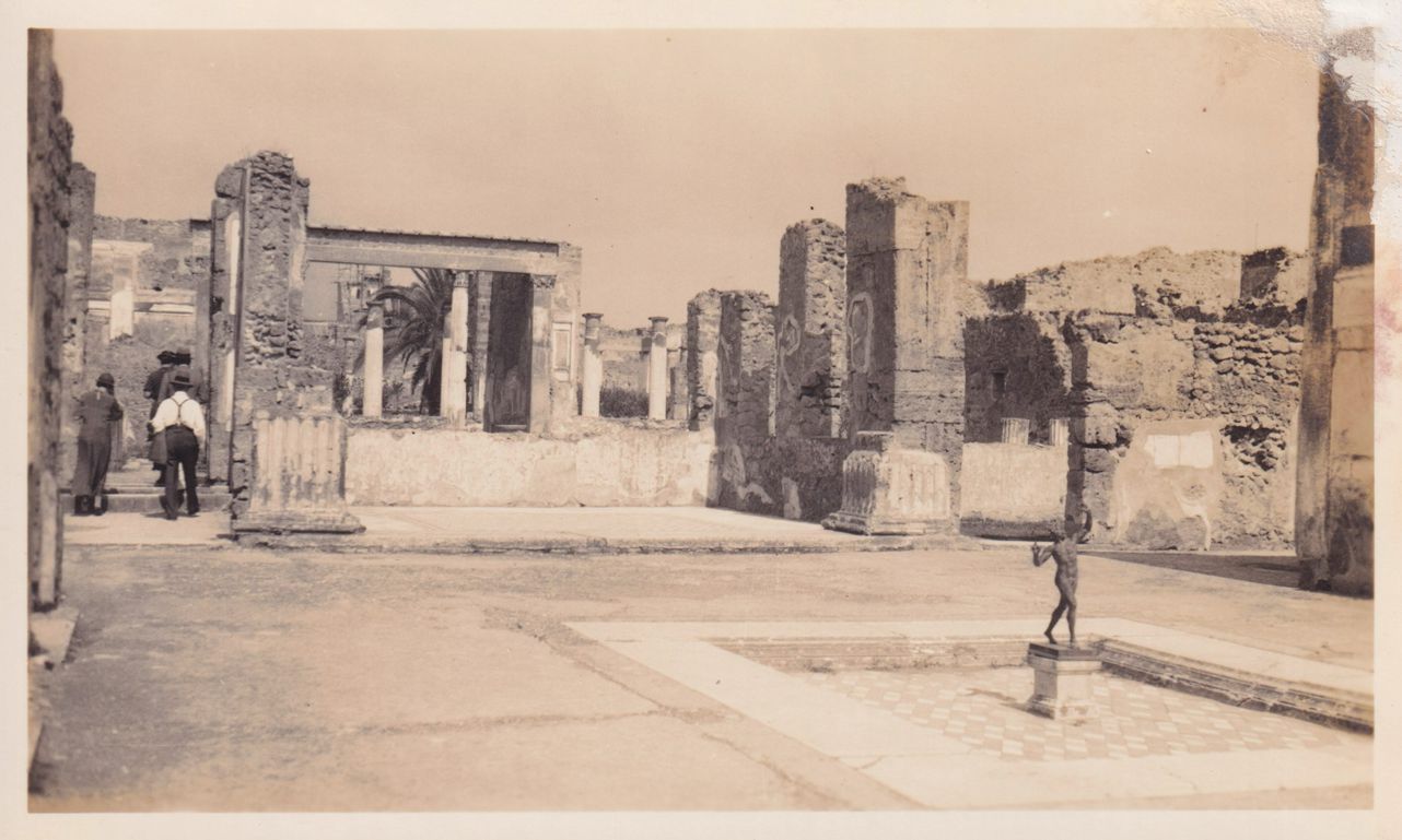 Black-and-White photograph of ruins at Pompeii, with an empty fountain at center. People can be seen walking through in the background. Photograph was likely taken by a person on vacation in Italy and printed by Kollecker's Kodak and Gift Shop.