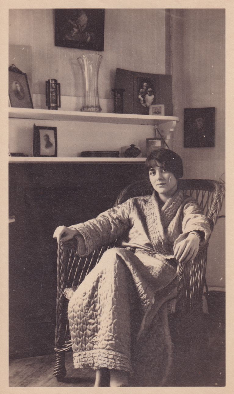 Black and white photograph of a woman wearing a robe sitting in a wicker chair.