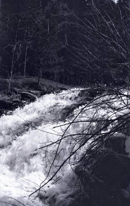 Negative of water rushing down rocks in a forest. Most likely taken by Mary Ives Baldwin. This item is not fully cataloged but has been uploaded so the image is publicly available; if you would like us to prioritize cataloging this item, please contact the HSL Collections team.
