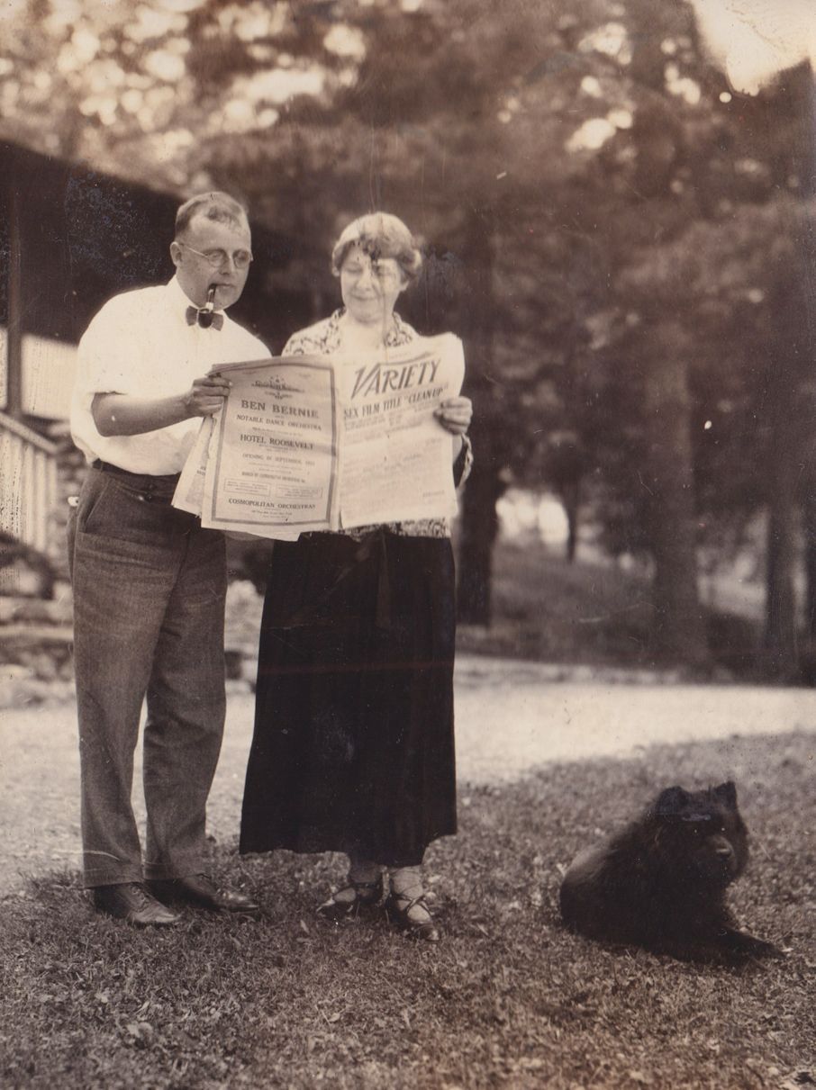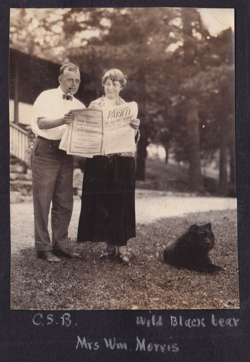 Black and white photograph of Charles Swasey "Beanie" Barnet and Emma Berlinghoff Morris standing together and looking at a copy of Variety Magazine. There is a black dog sitting in the grass next to them. They are likely standing in the yard of Camp Intermission. Beneath the photo is the caption, "C.S.B., Wild Black bear, Mrs Wm. Morris."