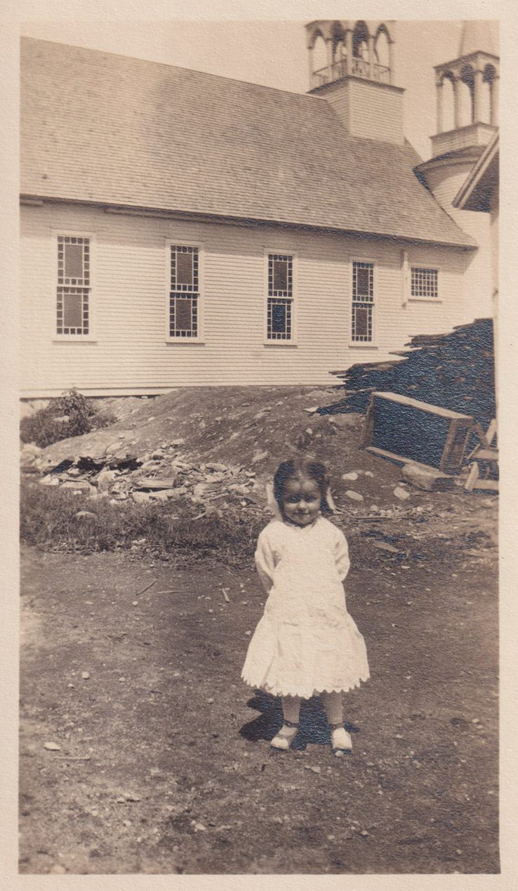Black-and-White photograph of an unidentified little girl standing beside an unidentified church or school. The photograph was likely printed by Kollecker's Kodak and Gift Shop.