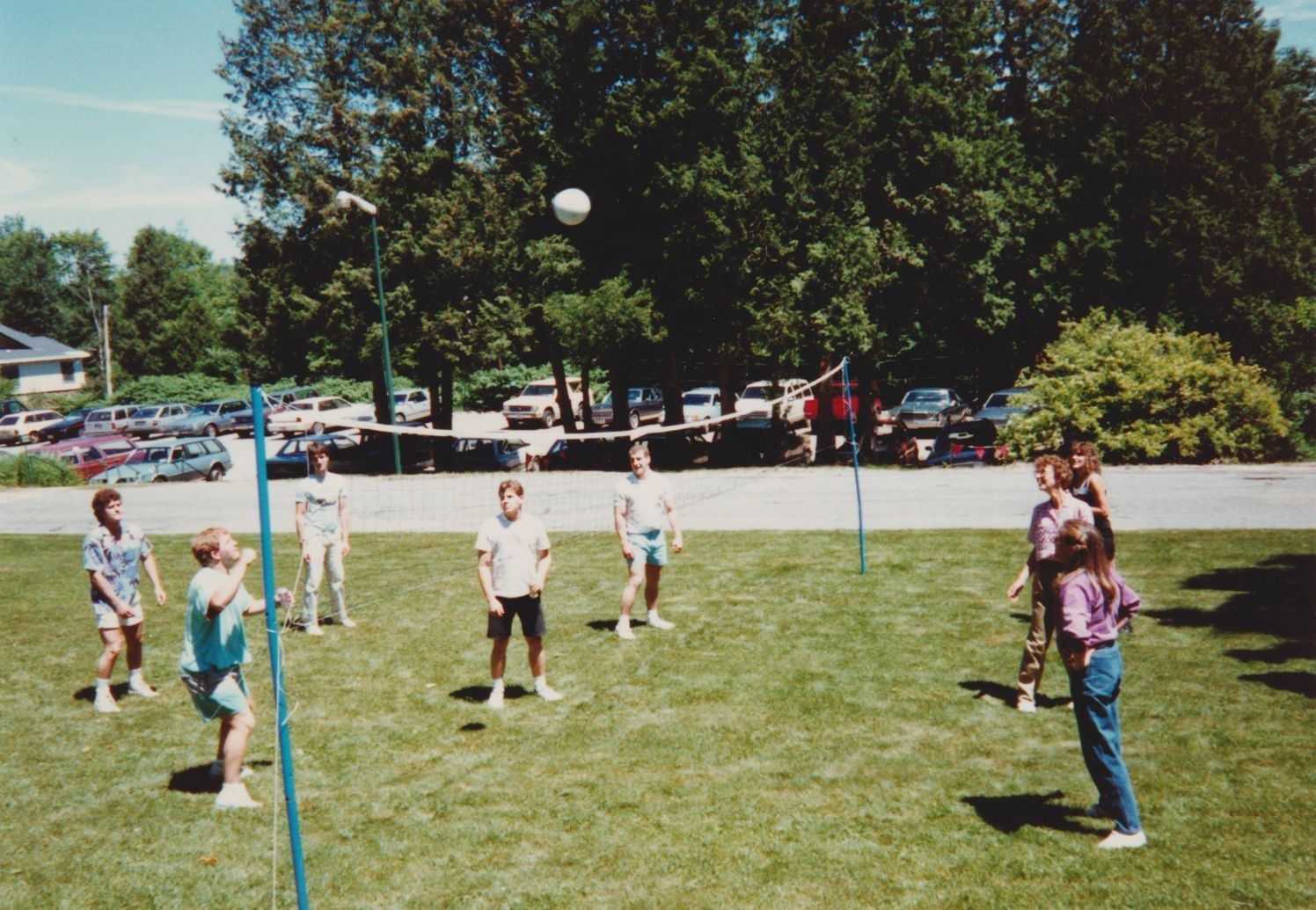 Color photograph of a group of people playing volleyball on a patch of grass outside. A parking lot can be seen behind them. This photograph is from an album of photographs taken at the American Management Association.