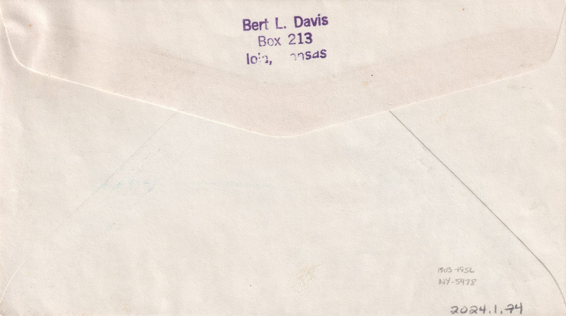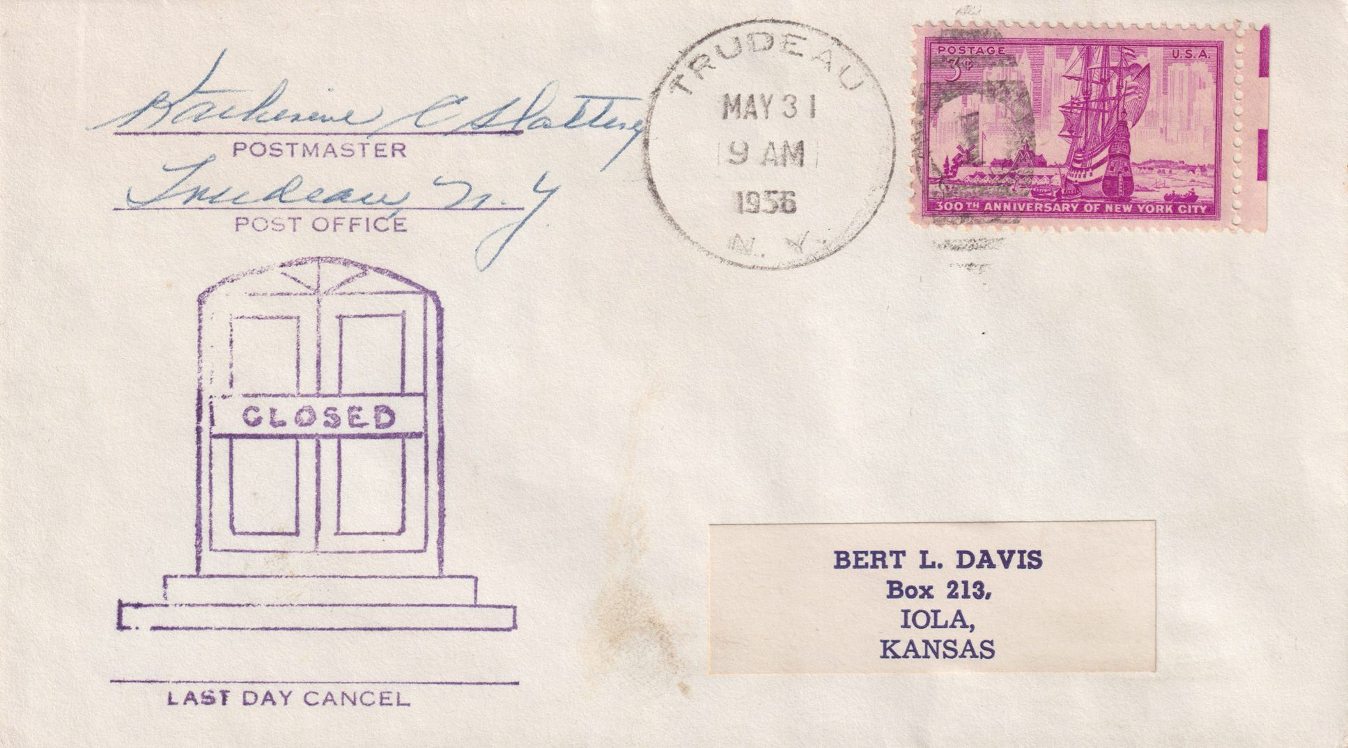 Envelope commemorating the last day of the Trudeau, NY Post Office. Has a stamp in purple ink with an image of a closed door, reading "Last Day Cancel." Handwritten in is the name of postmaster Katherine C. Slattery. Postmarked Trudeau, NY, May 31, 1956. Mailed to Bert L. Davis, Box 213, Iola, KS.Collection