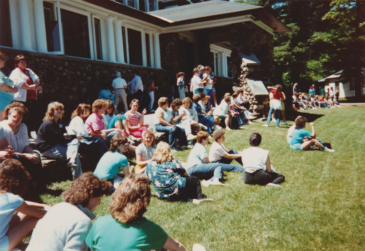 Color photograph of a large group of people, some standing against the outside wall of a building, and others sitting on benches or the grass in front of them. This photograph is from an album of photographs taken at the American Management Association.