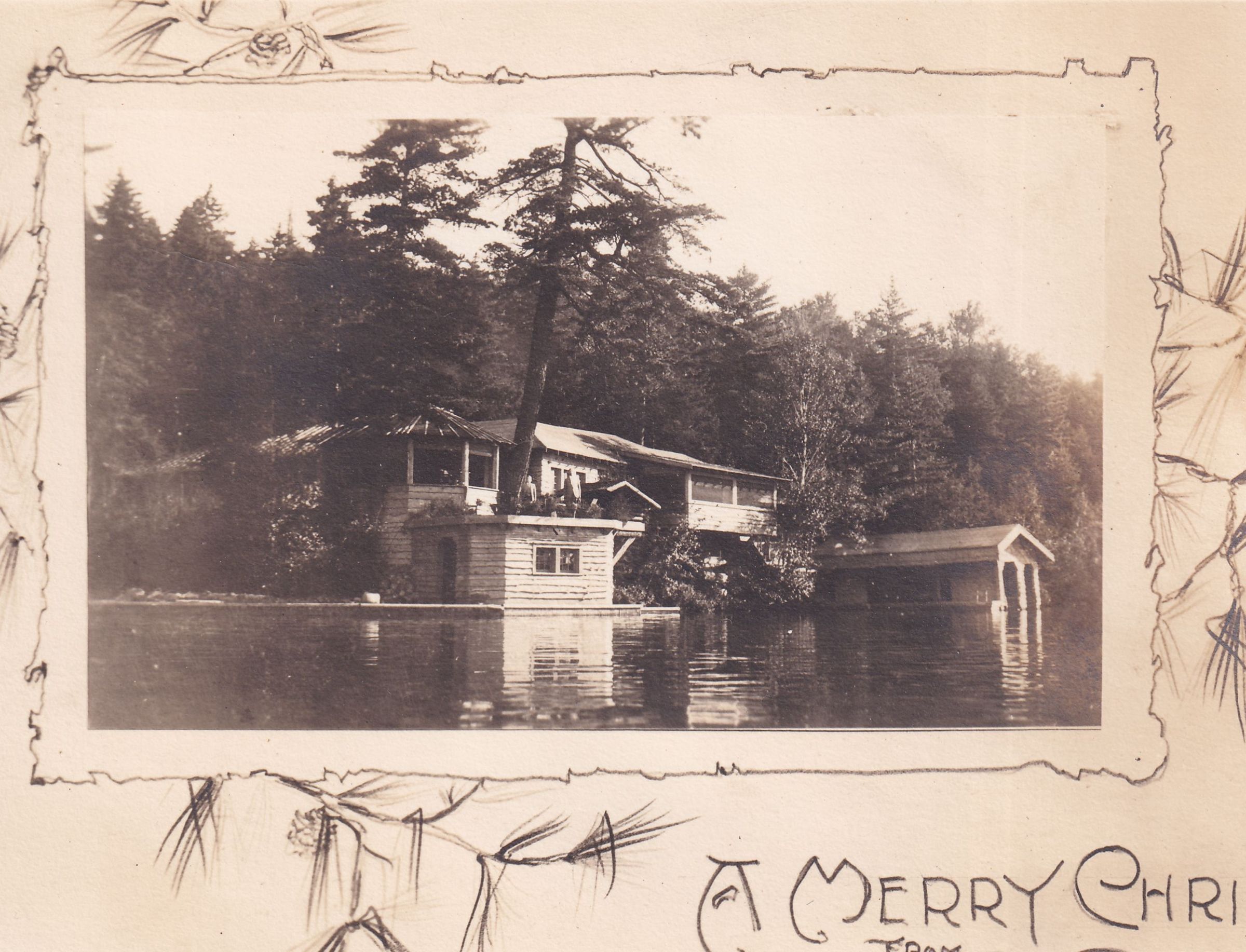 Black-and-white photograph showing a camp along a body of water. People can be seen standing on the roof of a small building along the water. It has been cropped from a Trudeau family Christmas card; there is a pine-themed border around the image. A cropped handwritten note reads, "A Merry Chri..."Collection