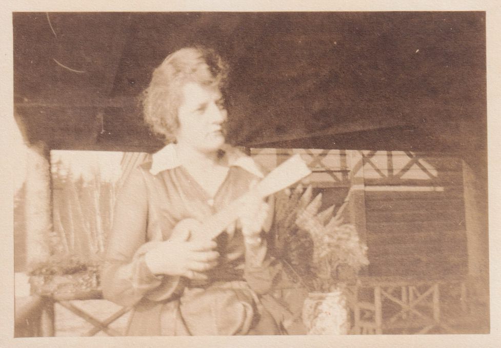 Black-and-White photograph of a woman playing a ukulele. She is on an open porch. The photograph was likely printed by Kollecker's Kodak and Gift Shop.