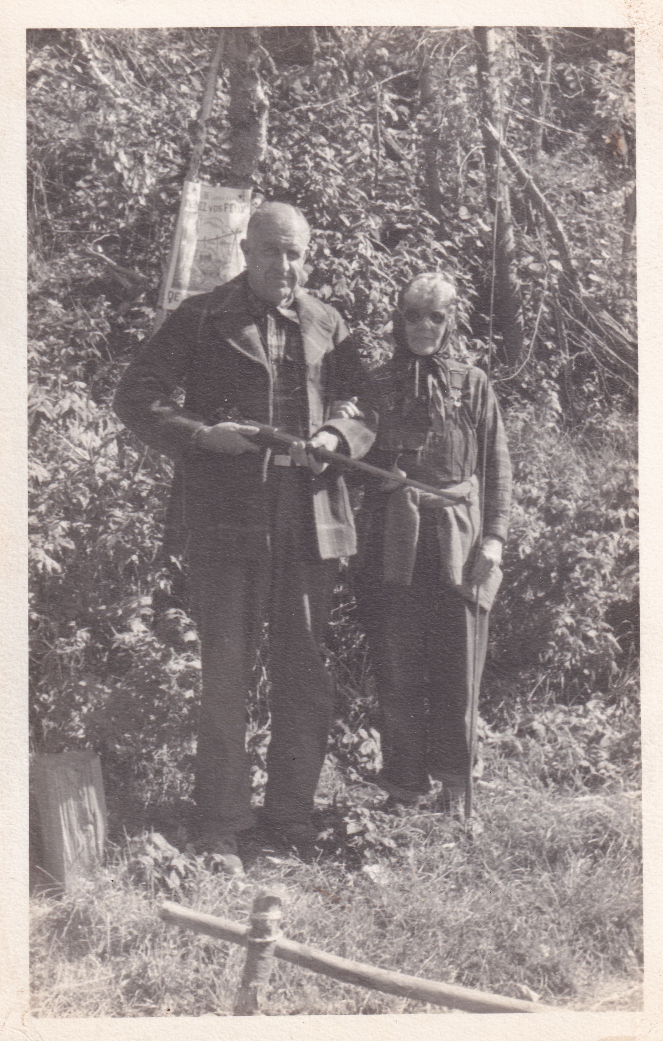 Black-and-white photograph of Francis Berger Trudeau and Helen Trudeau. Francis is dressed in a plaid coat and holding a gun horizontally in front of him. Helen is holding his arm with her right hand and a fishing pole in her left. She is wearing a kerchief and sunglasses.