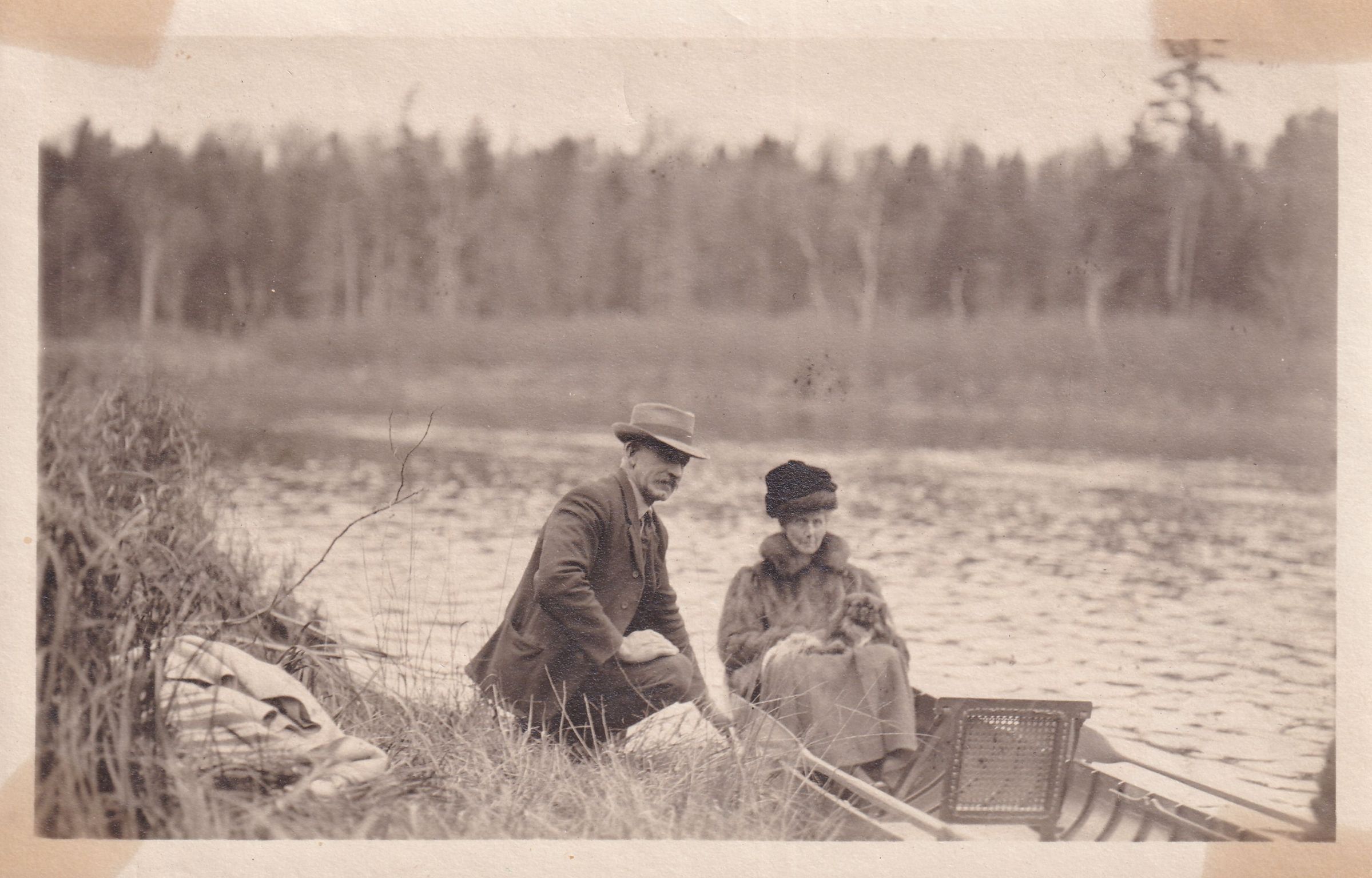 Black-and-white photograph of an unidentified guide with Charlotte Beare Trudeau. Mrs. Trudeau is wearing a fur coat, seated in a guideboat on the water with a small dog in her lap. The guide is leaning over holding the edge of the boat. There is a woolen blanket laying in the grass next to him.Photograph Details