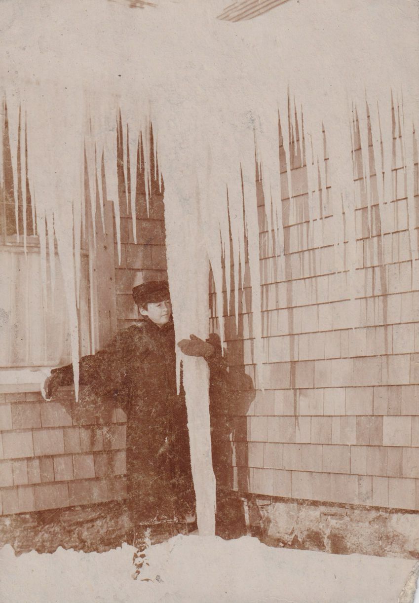 Photograph of a woman holding onto a large icicle, 1894.