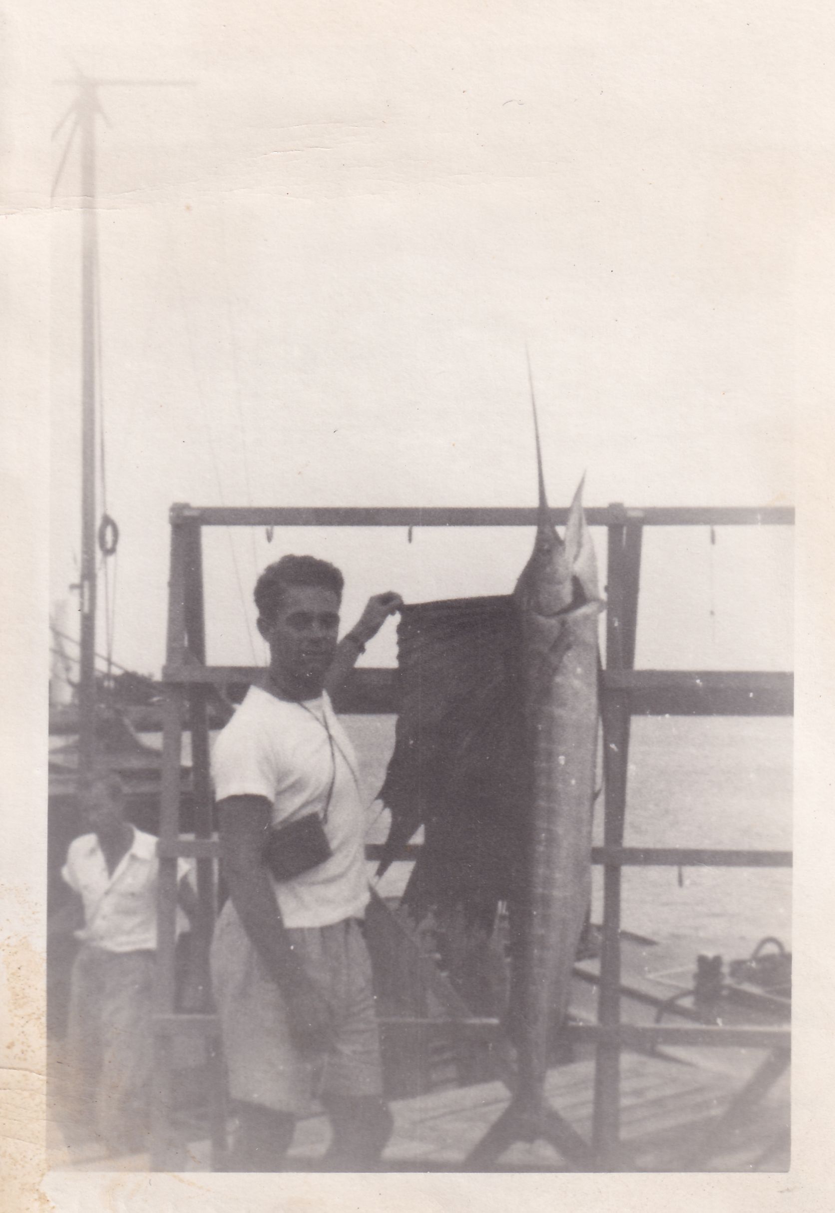 Black-and-white photograph of Frank Trudeau standing on a dock next to a large hanging sailfish. He is holding the fish's fin up for the camera.