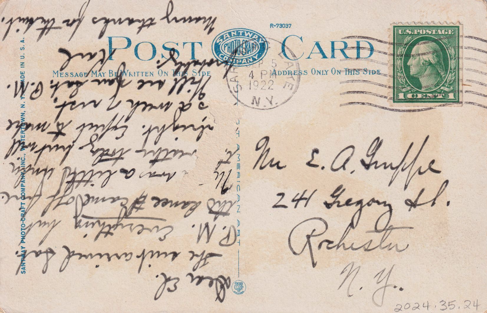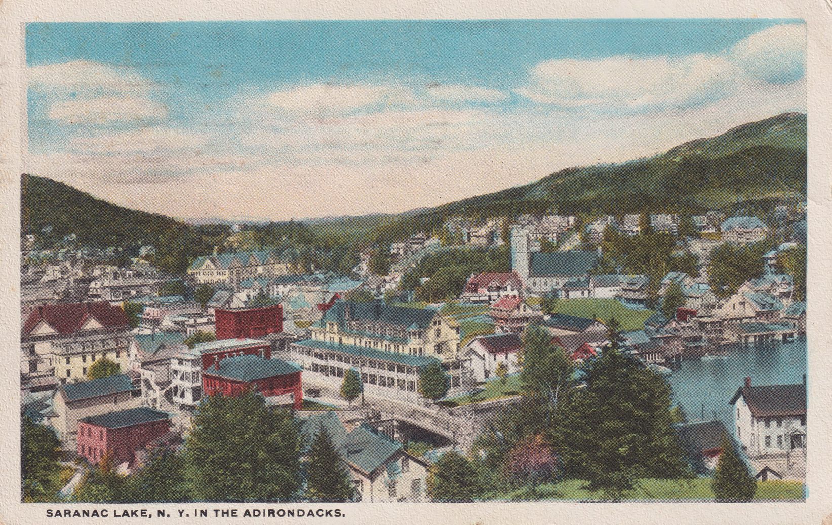 Color postcard showing the view of Saranac Lake from Blood Hill/Lake Street Hill. Printed caption on front reads, "Saranac Lake, N. Y. in the Adirondacks." Printed by Santway Photo-Craft Company, Watertown, NY. Used, divided back, white border, postmarked Saranac Lake, September 5, 1922. Handwritten message on back reads, "Dear Ed, The suit arrived Sat. P.M. Everything but the [?] came off fine. [?] was a little under the weather today but will be alright. Expect to make [?] a week of rest. Will see you Sat. P.M. probably. Karl. Many thanks for the suit." Mailed to Mr. E. A. Guppe [?], 241 Gregory St., Rochester, NY.Subject Place