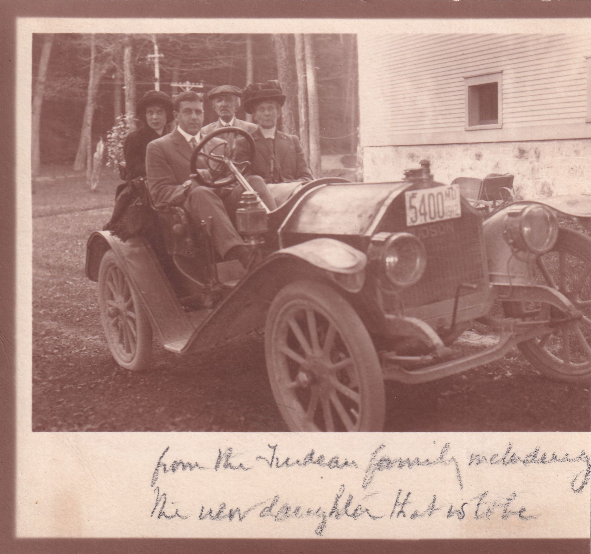 Black-and-white photograph Christmas card of the Trudeau Family seated in a Hudson automobile. Francis Berger Trudeau is seated behind the wheel, Charlotte Beare Trudeau in the passenger seat, Helen Garretson [later Trudeau] behind Francis, and Dr. Edward Livingston Trudeau next to her. Handwritten message on the bottom of the card reads, "from the Trudeau Family including the new daughter that is to be." The right-hand side of the card has been trimmed off.Collection