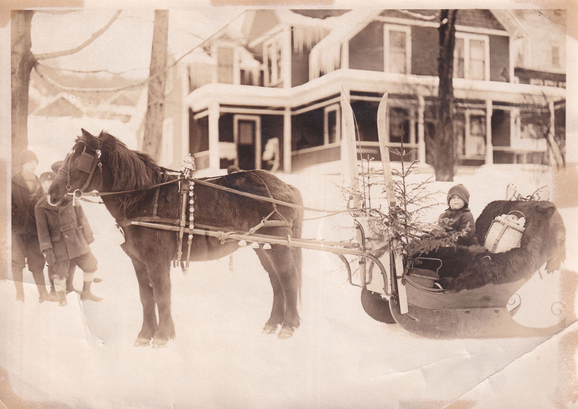Black-and-white photograph of a small child (possibly Frank Trudeau) seated in a horse-drawn sleigh. The sleigh is decorated with evergreen branches, skis, a fur, and a pack basket, likely for the Winter Carnival parade. Two young boys are standing just behind the horse, and a large cure cottage can be seen along the road.Photograph Details