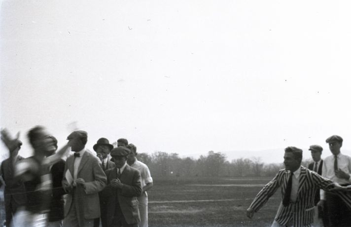 Negative of a blurry runner, maybe the winner of a race, running in front of a line of spectators. The runner is wearing a tank top with the letter "H" on it. Most likely taken by Mary Ives Baldwin. This item is not fully cataloged but has been uploaded so the image is publicly available; if you would like us to prioritize cataloging this item, please contact the HSL Collections team.