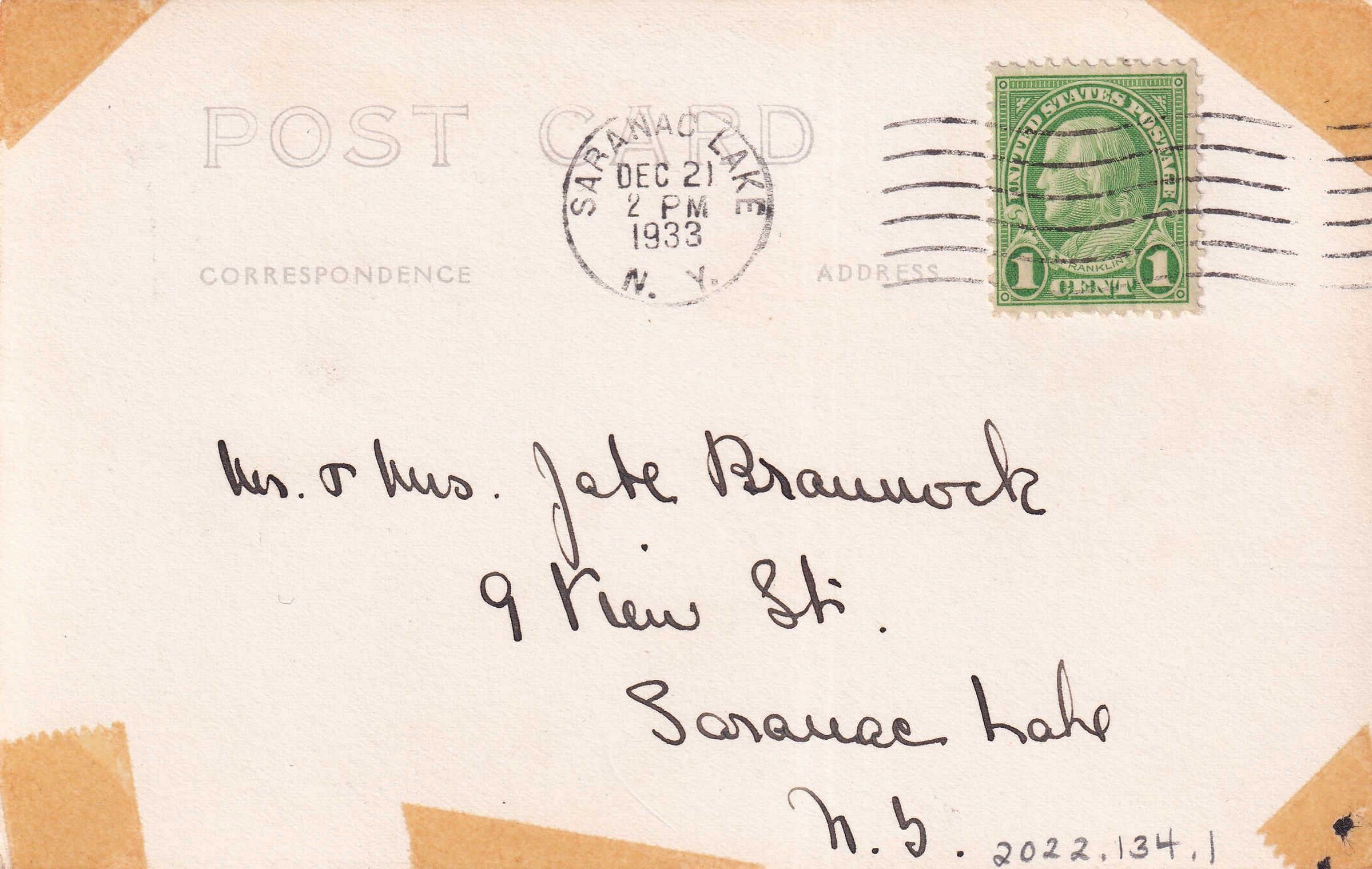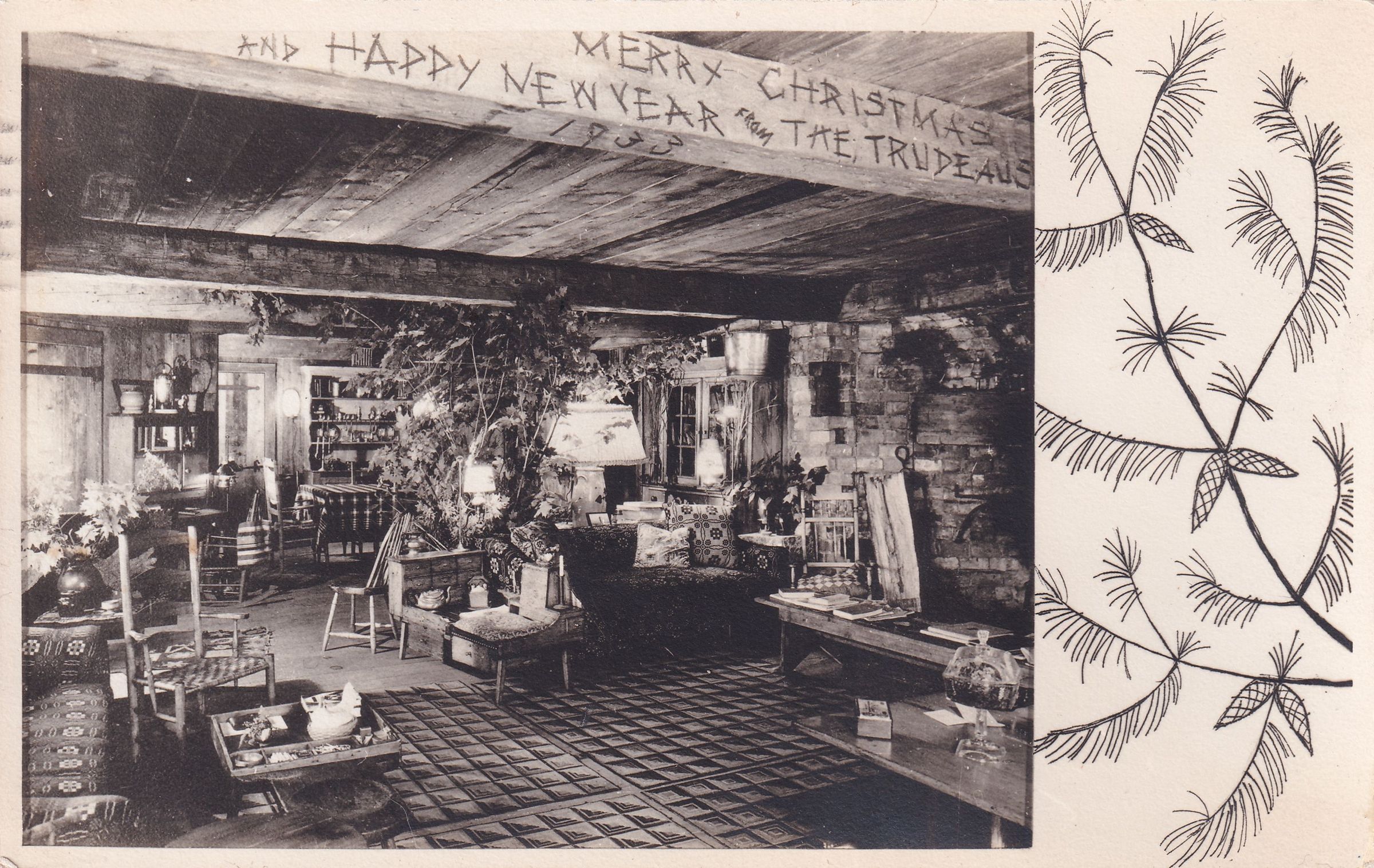 Black-and-white Trudeau Family Christmas photograph postcard, showing the interior of a camp great room. "Merry Christmas and Happy New Year from the Trudeaus, 1933" has been written on the image along one of the ceiling beams. There is a hand-drawn pine bough with pinecones on the right side of the card. Postcard backing, postmarked December 21, 1933. Mailed to Mr. & Mrs. Jabe Brannock, 9 View St., Saranac Lake, NY.Subject Person/Organization