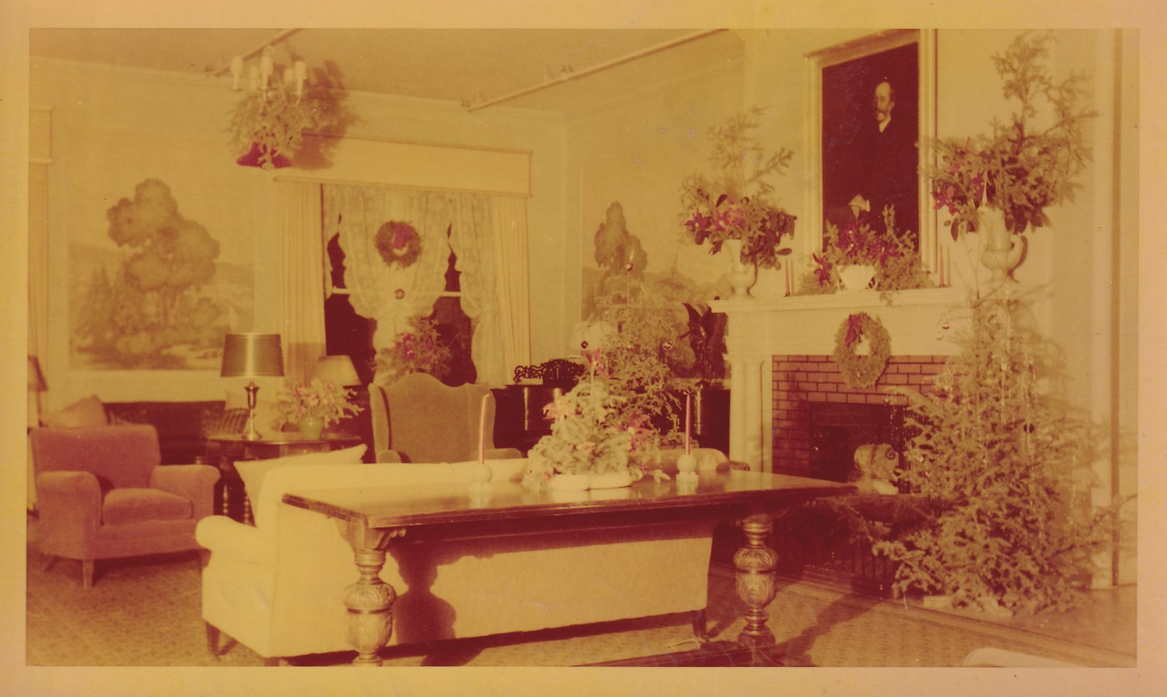 Color photograph of the living room at Trudeau Sanatorium, decorated for Christmas 1950 or 1951. The room is decorated with greenery, wreaths, and trees. There is a portrait of Dr. Edward L. Trudeau hanging over the fireplace. Handwritten caption on back reads, "Trudeau Living room, Christmas, 1950." Stamped on back, "This is a Kodacolor Print, made by Eastman Kodak Company. T. M. Regis, U. S. Pat. Off. Week of May 28, 1951. 11 1."Photograph Details