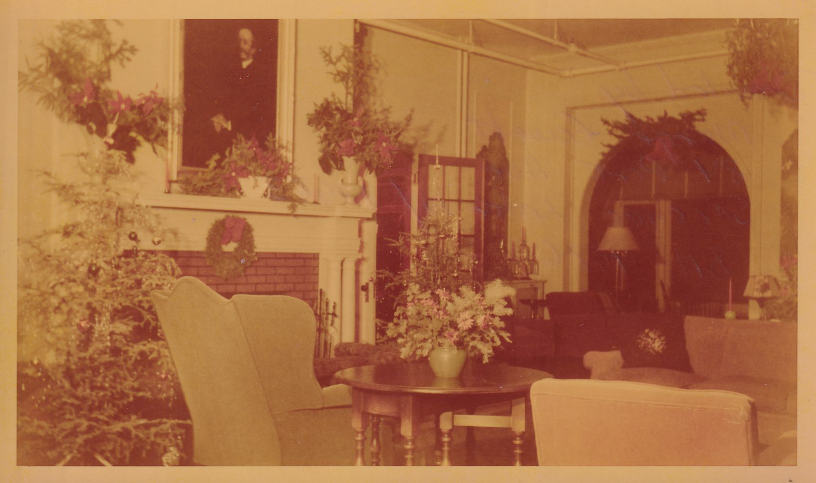 Color photograph of the living room at Trudeau Sanatorium, decorated for Christmas, 1950 or 1951. There is a portrait of Dr. Edward L. Trudeau hanging over the fireplace, and the room is decorated with trees, wreaths, and other greenery. Handwritten caption on back reads, "Trudeau Living room, Christmas, 1950." Stamped on back "this is a Kodacolor Print, made by Eastman Kodak Company. T. M. Regis, U. S. Pat. Off. Week of May 28, 1951. 11 1."Photograph Details