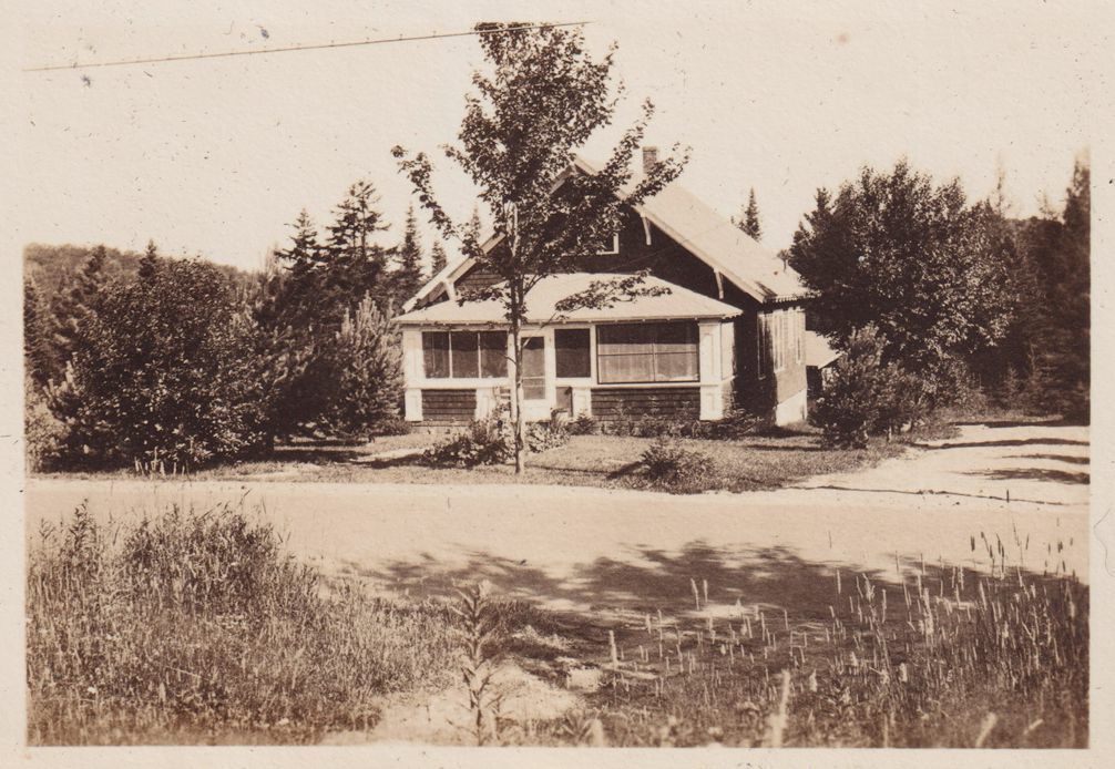 Black-and-White photograph the Jones Family's third rental home in Saranac Lake, another bungalow on Lake Street. The photograph was taken from across the street. Part of album 2024.21.1, kept by Amy Jones and David Blair Jones c. 1930-1934.