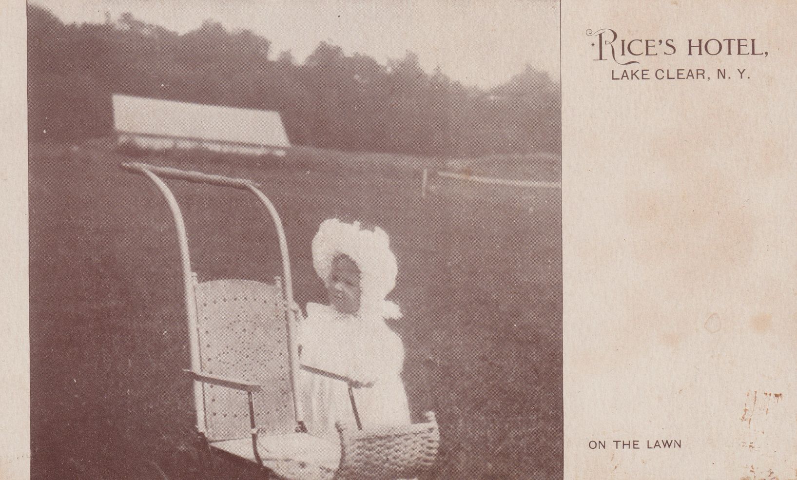 Black and white photo postcard of a toddler standing next to a stroller on the lawn at Rice's Hotel in Lake Clear, NY.