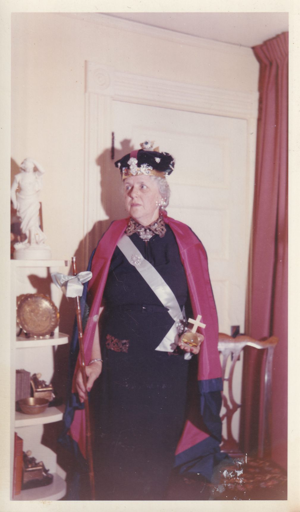 Color photograph of a woman dressed in a costume as "Queen Mary," October 1951. This may be Marge Gowett. She is wearing a sash, crown, and cape, and holding a walking stick and orb. Handwritten caption on back reads, "'Queen Mary,' Oct. '51. Clowning at a party, her sceptre was my class cane! Williams 1909." Stamped on back, "this is a Kodacolor print, made by Kodak. June 1962."Photograph Details