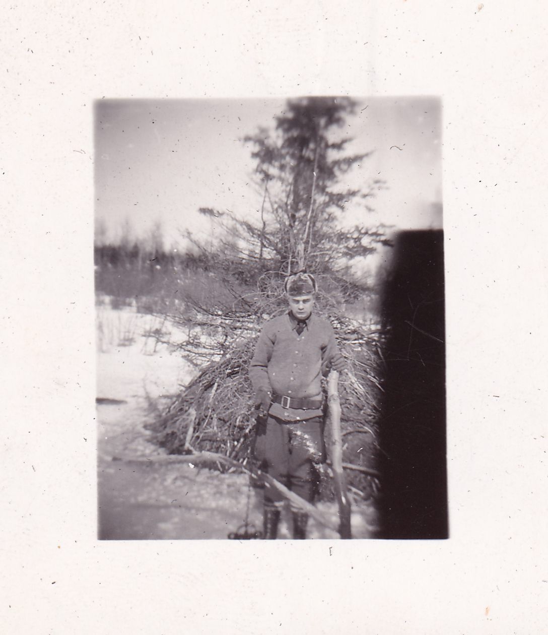 Black-and-White photograph of a man standing in front of a beaver dam.