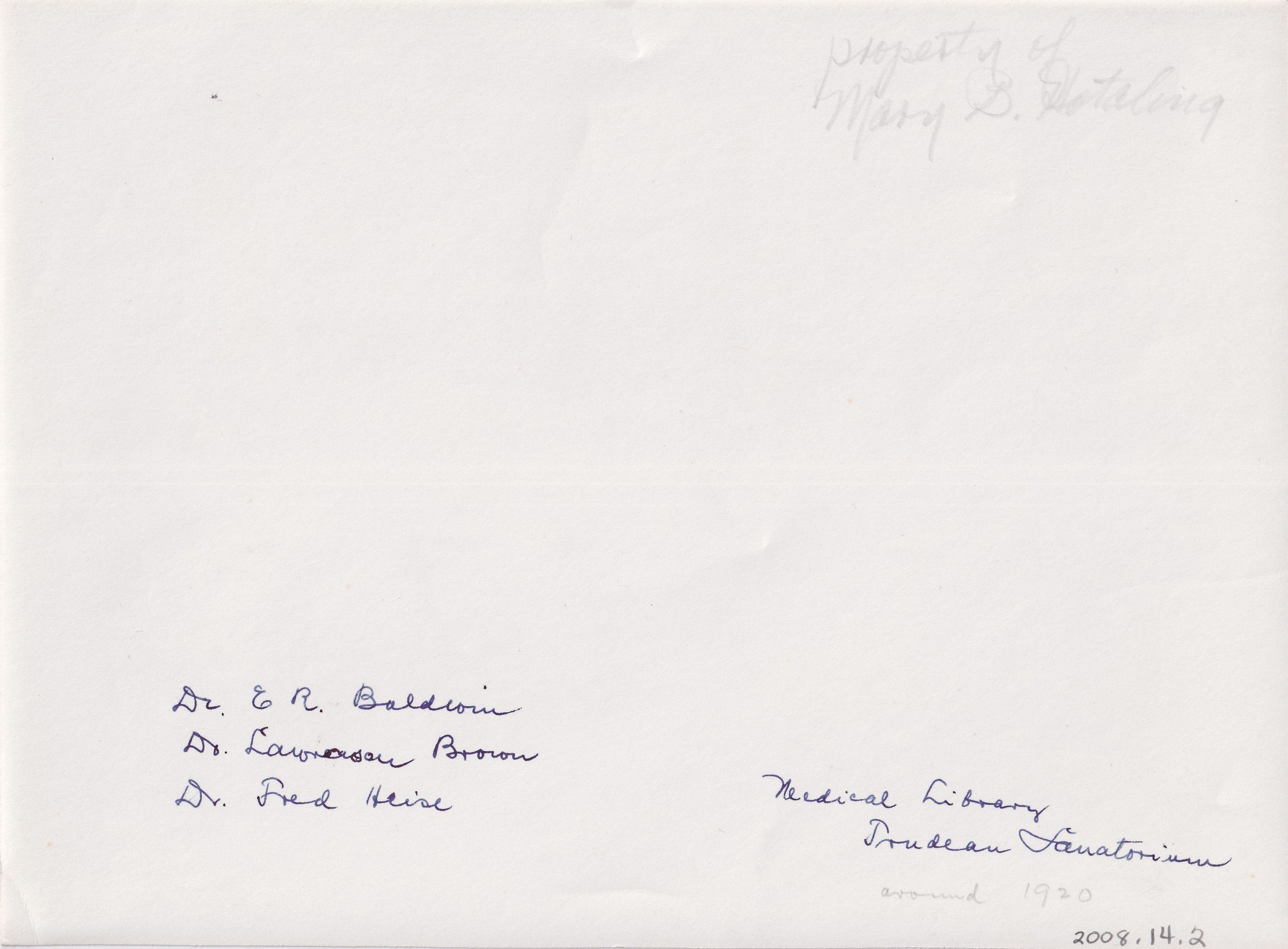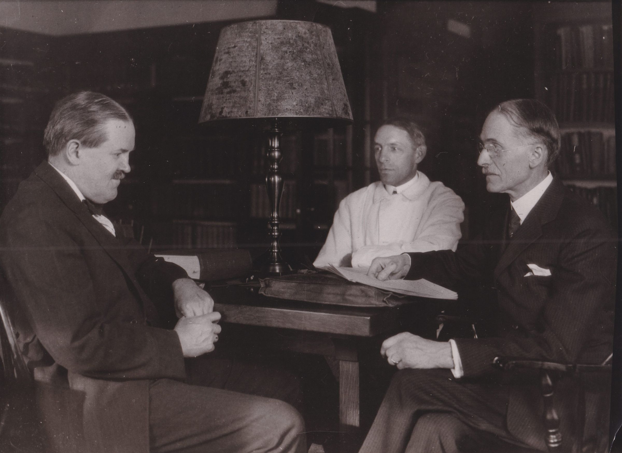 Black-and-white photograph of (L to R) Dr. Lawrason Brown, Dr. Fred H. Heise, and Dr. Edward R. Baldwin, seated around a table in the Trudeau Sanatorium Medical Library. There is a large lamp on the table between the men, and bookshelves line the walls. Handwritten caption on back reads, "Dr. E. R. Baldwin, Dr. Lawrason Brown, Dr. Fred Heise. Medical Library, Trudeau Sanatorium, around 1920."Photograph Details