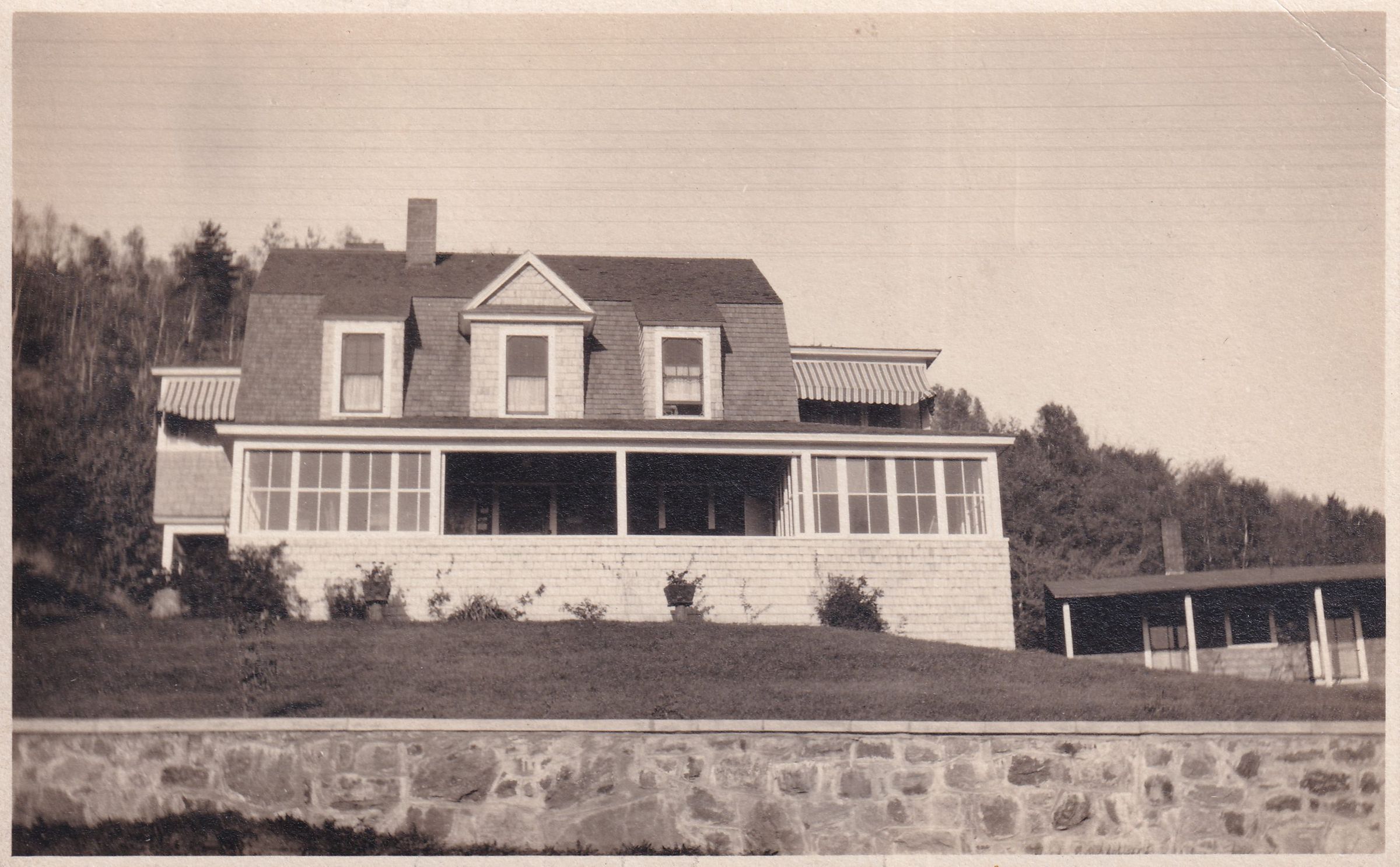 Black-and-white photograph postcard showing the Carr Cottage at 38 Park Avenue. The rock wall at the base of the front lawn is visible. Some of the cure porches have striped awnings. The image was taken prior to the construction of the Annex, so the Sarah H. Chester Cabin [36 Park Avenue, no longer standing] is visible. Handwritten note on back indicates the date as 1908. Postcard backing, unused.