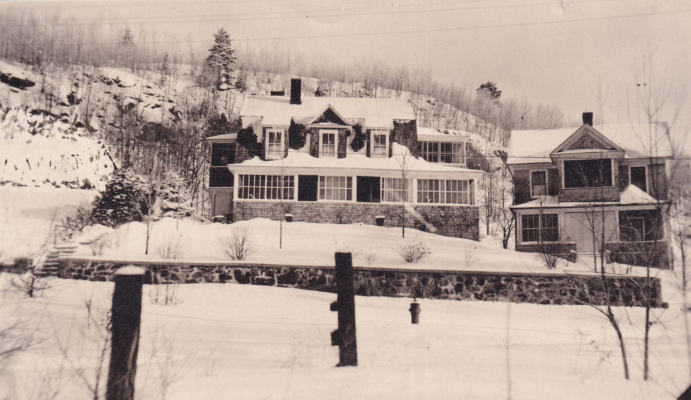 Black-and-white photograph of the Carr Cottage and Carr Cottage Annex on Park Avenue in the snow, taken from across the street. The rock wall and stairs along the property are visible.