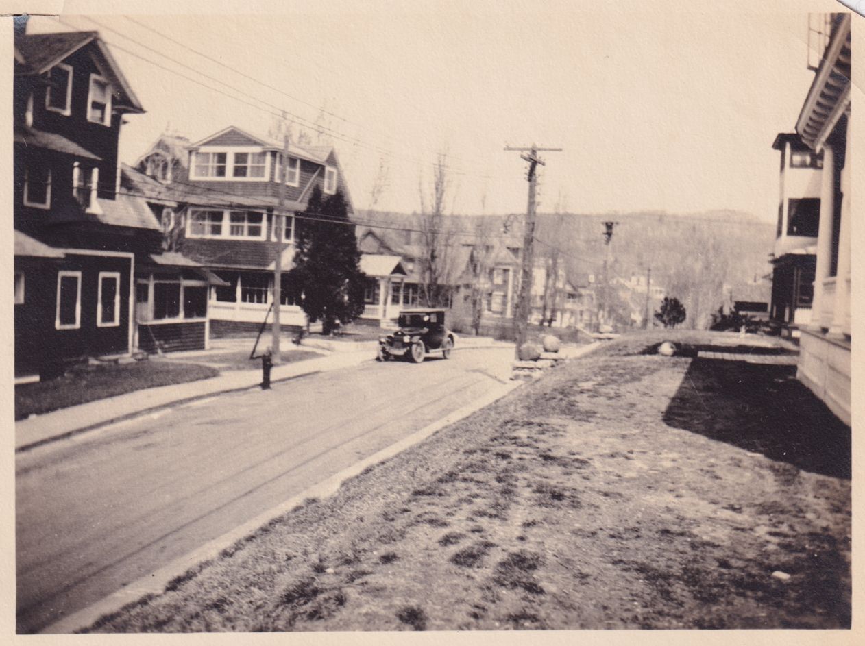 Black-and-White photograph taken from the raised front lawn of the Alta Vista Lodge, looking north up Franklin Avenue toward Helen Street. The Robinson/Kerr Cottage [45 Franklin Avenue, now a vacant lot] can be seen across the street behind a 1920s-era automobile.
