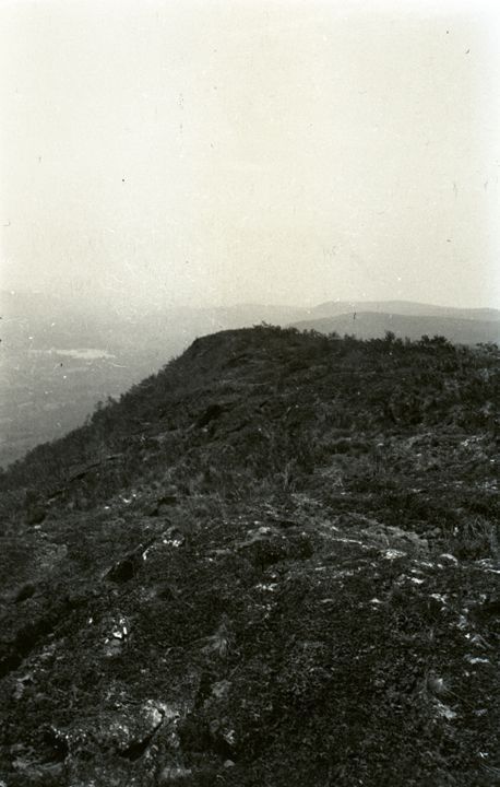 Negative of a the view of a mountain top with more mountains in the distance, partially obscured by fog. Most likely taken by Mary Ives Baldwin. This item is not fully cataloged but has been uploaded so the image is publicly available; if you would like us to prioritize cataloging this item, please contact the HSL Collections team.