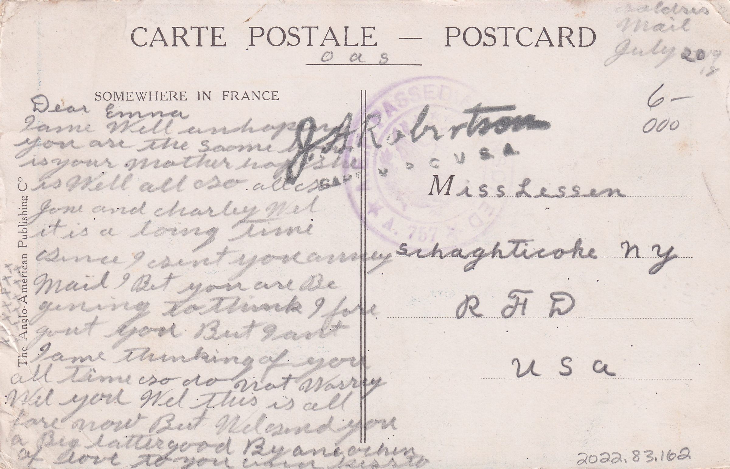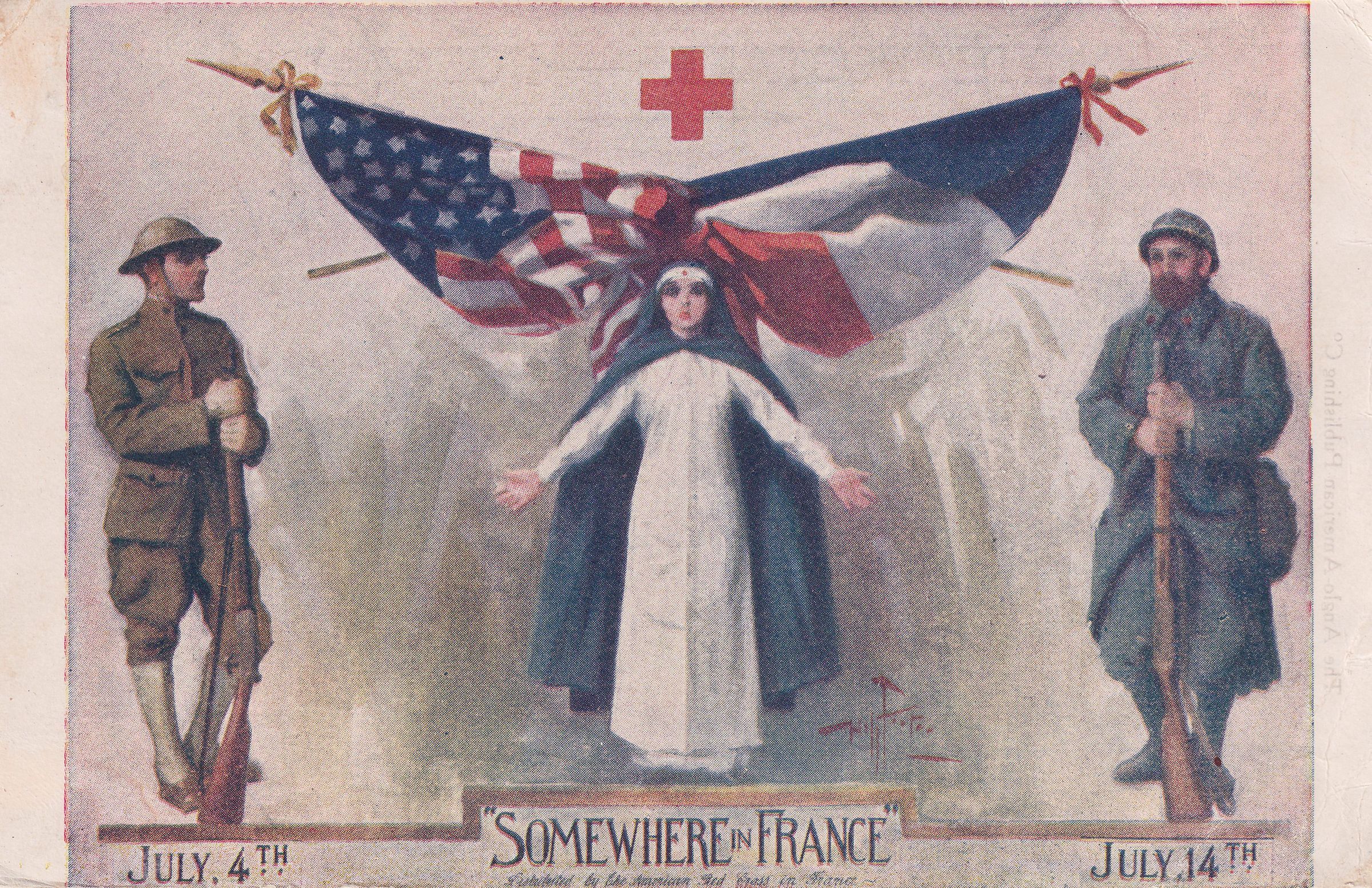 Color postcard with an image of an American and a French soldier, with a nurse standing with arms outstretched between them. There are American and French flags above her, with a Red Cross. Printed caption on front reads, “July 4th, July 14th, Somewhere in France.”Collection