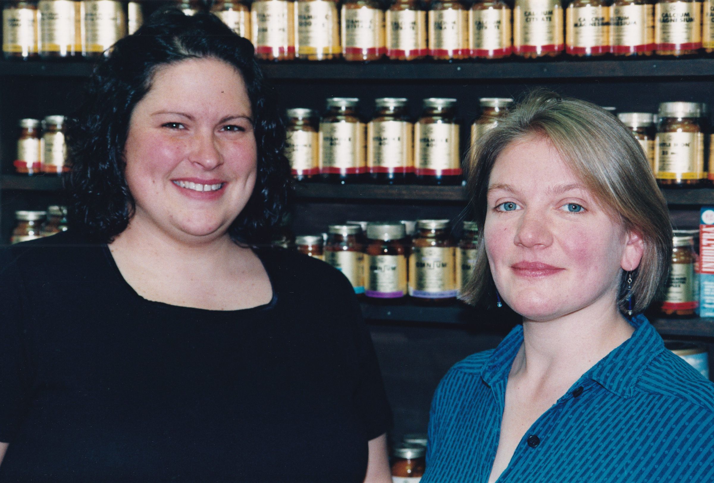 Color photograph of Lori Dodge and Amy McCloskey in front of a shelf of supplements inside of their business, Nori's Village Market. Portrait taken by Mary Lou Hanpeter Banks as part of her Soul Proprietor exhibition.