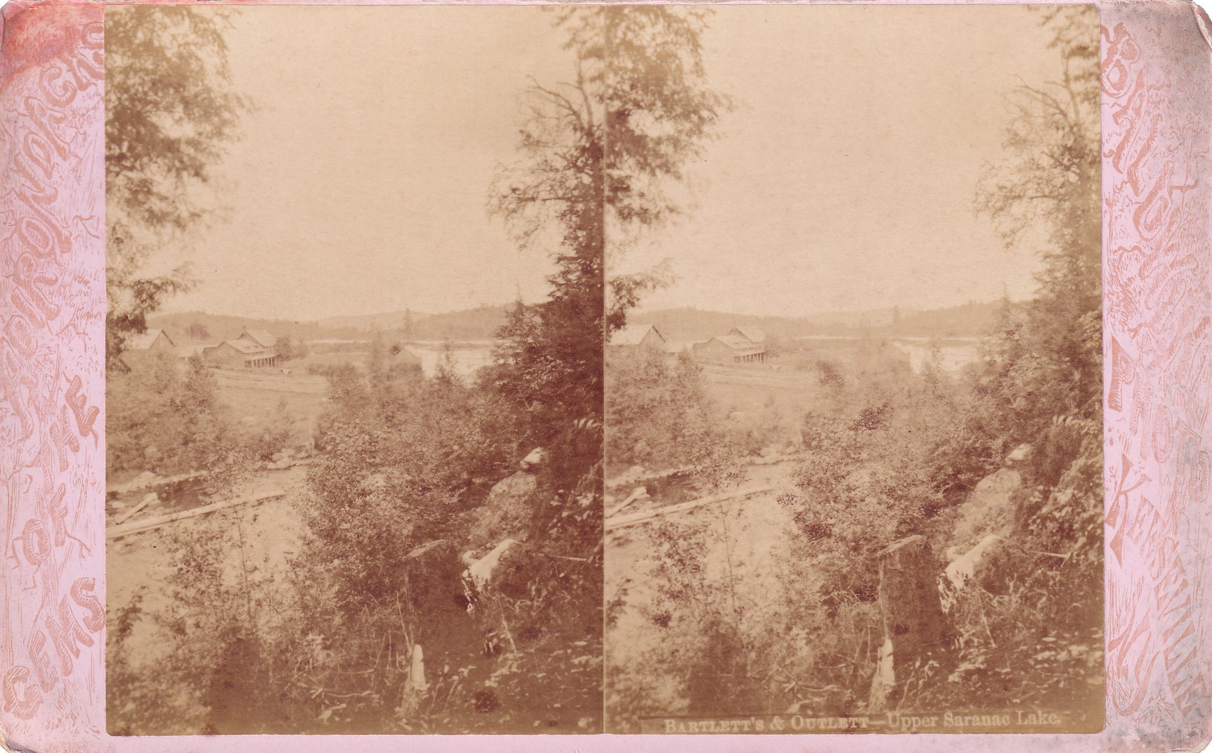 Black-and-white stereoview image of a view through trees and shrubs toward a building. Printed caption on image reads, "Bartlett's & Outlett--Upper Saranac Lake." Mounted on pink cardboard backing reading, "Gems of the Adirondacks - Baldwin Photo, Keeseville, N.Y." Handwritten note on reverse reads, "No. 26."Photograph Details