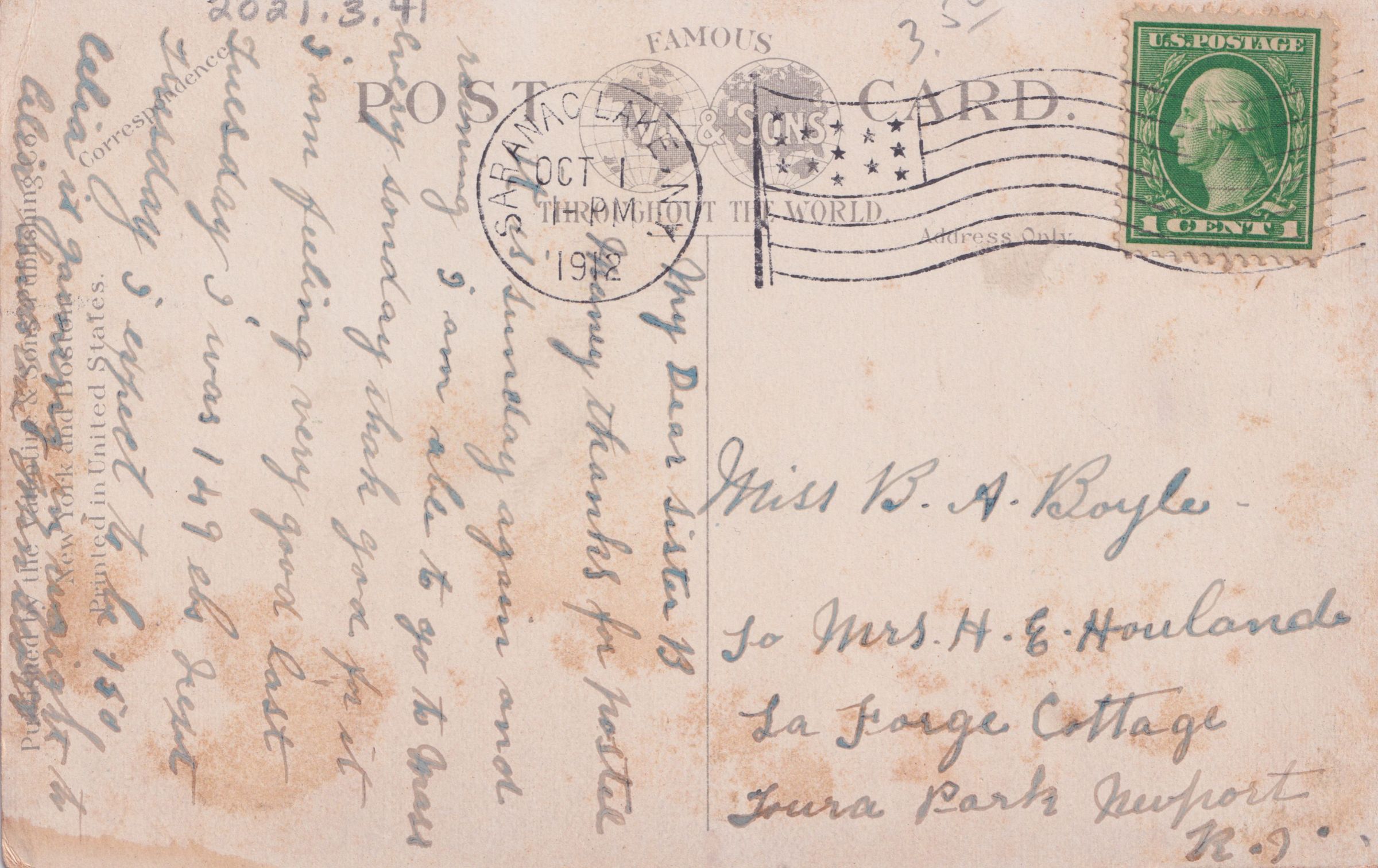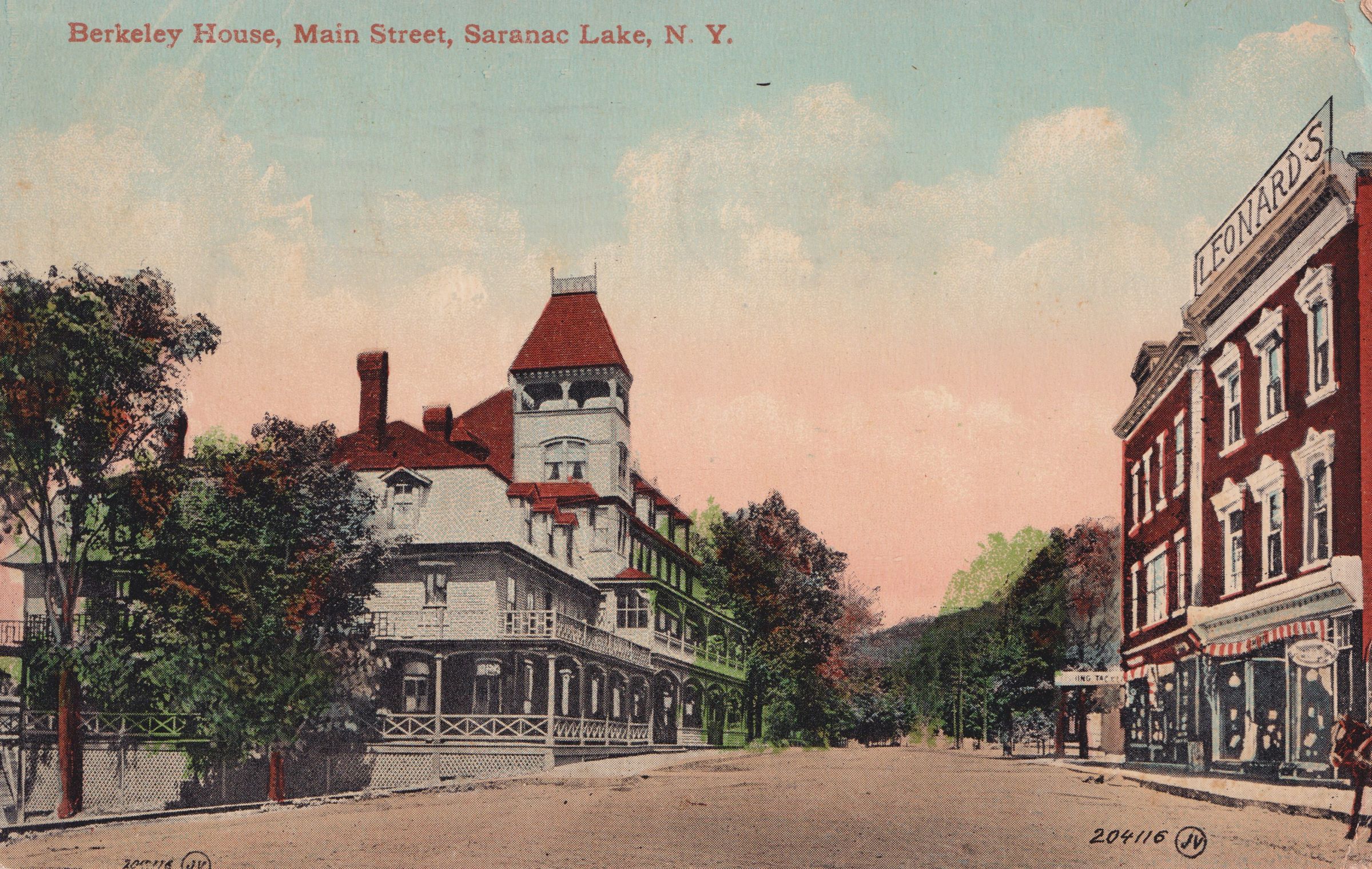 Color postcard looking east down Main Street from the intersection of Broadway and Main Street. The Berkeley Hotel/House is visible at left, and Leonard's Department Store at right. Used, divided back, postmarked October 1, 1912, Saranac Lake, NY. Printed by the Valentine & Sons Publishing Co. Ltd., New York and Boston. The printed caption on the front of the card reads, "Berkeley House, Main Street, Saranac Lake, N.Y." The handwritten message on the back reads, "My Dear sister B. Many thanks for postal. It is Sunday again and raining. I am able to go to Mass every Sunday, thank God for it. I am feeling very good. Last Tuesday I was 149 lbs. Next Tuesday I expect to be 150. Celia is gaining in weight too. Celia sends love. John Scott." Mailed to Miss B. A. Boyle, c/o Mrs. H. E. Houland, La Forge Cottage, Toura Park, Newport, R.I.Subject Place
