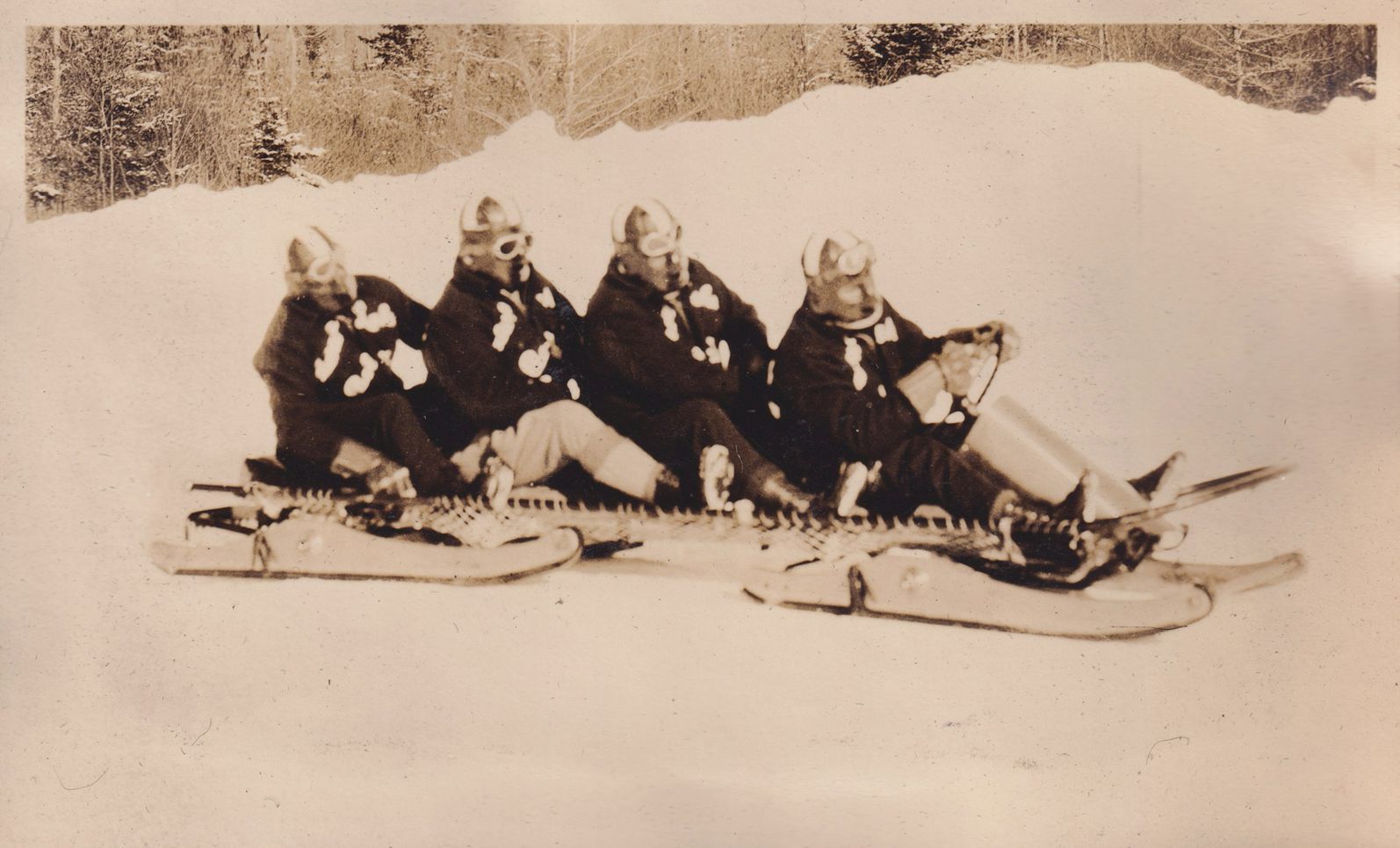 Black-and-White photograph of the Saranac Lake Red Devils bobsled team seated in their bobsled. They are all wearing helmets and jackets reading "Saranac Lake Bob Team.”