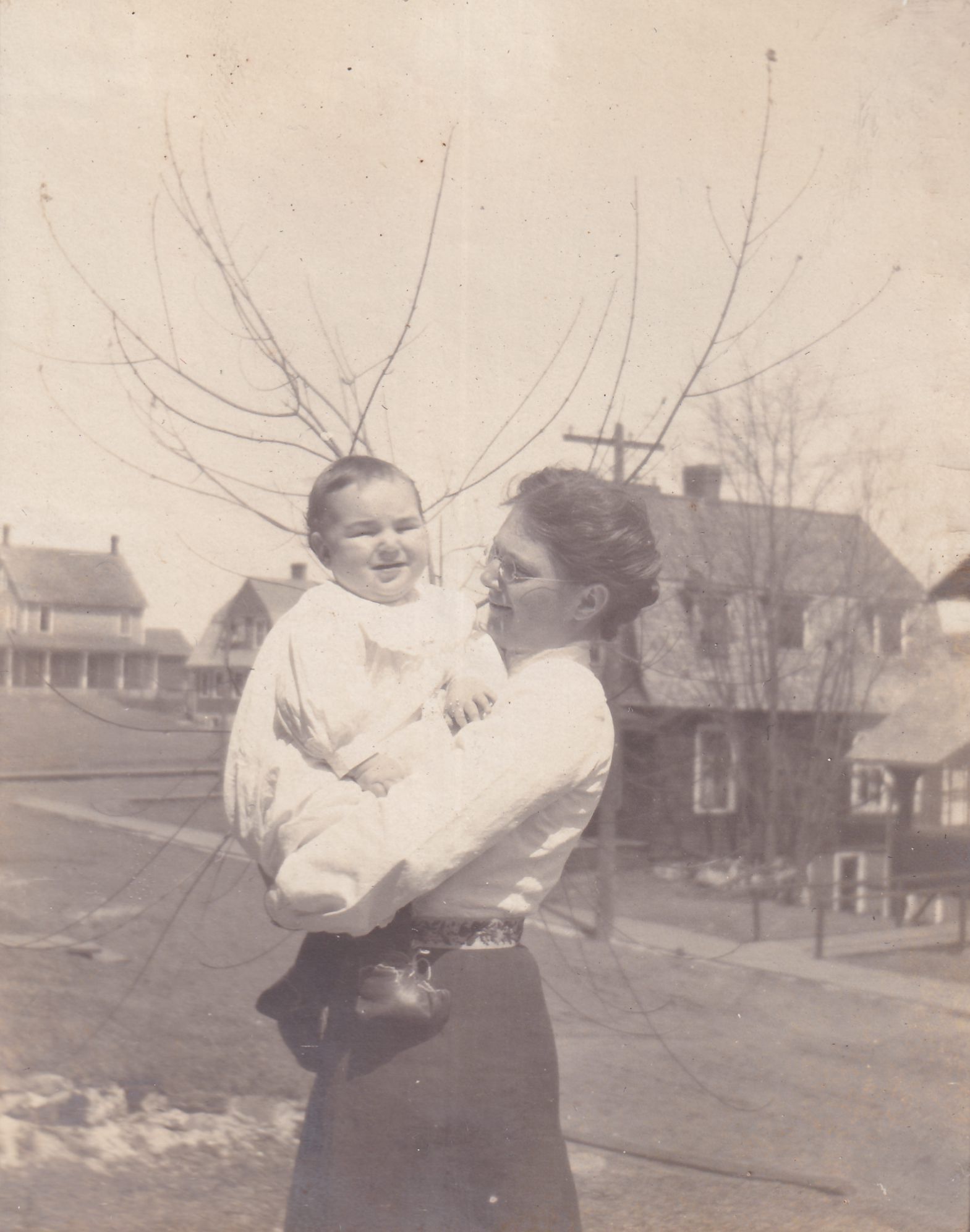 Photograph of Blanche Smith holding an infant John Dean Carrier. She is standing outside on Franklin Avenue.