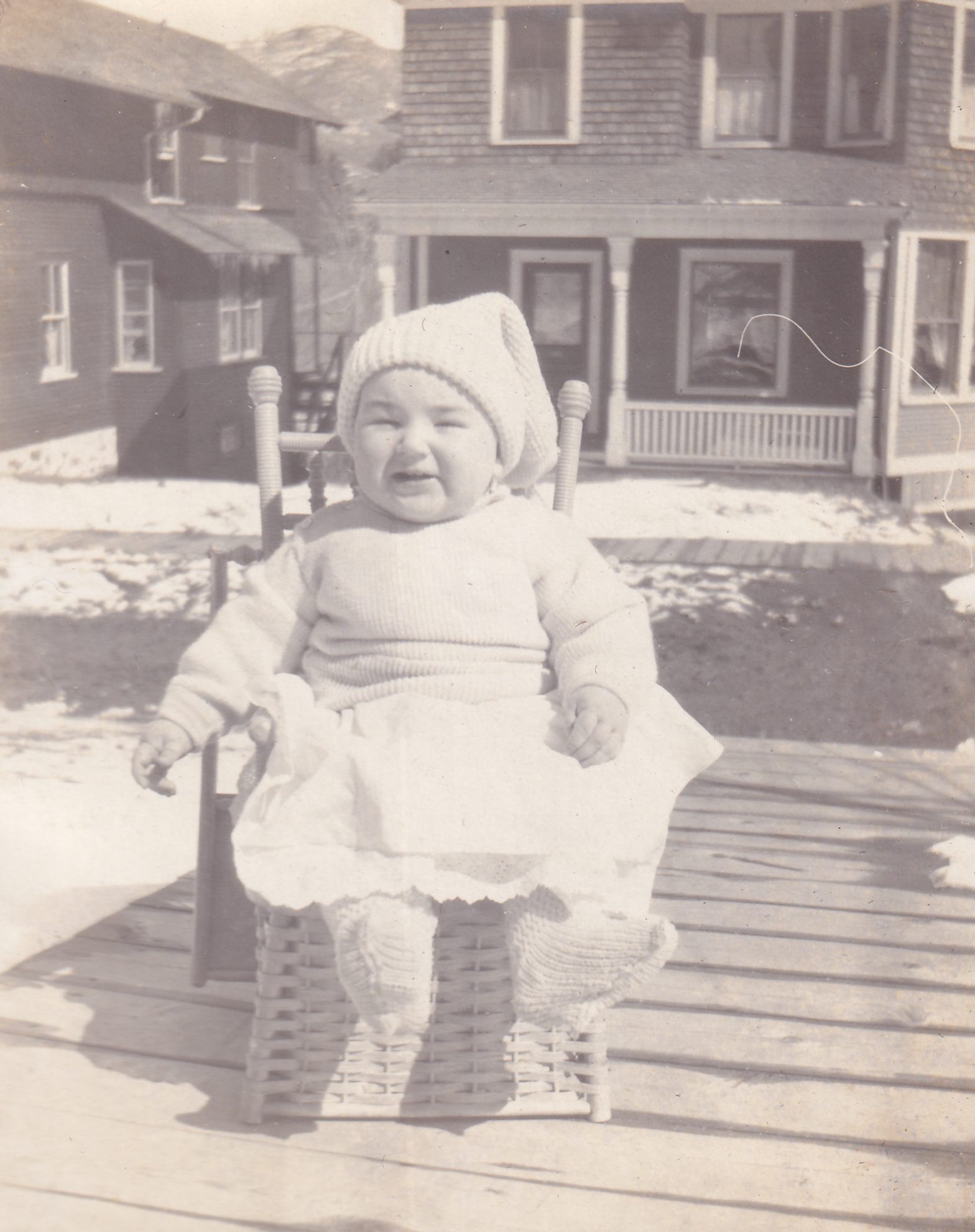 Photograph of an infant John Dean Carrier seated in a small wicker high chair. He is wearing a knit cap, sweater, and socks. 34 Franklin Avenue [80] can be seen behind him, and there is snow on the ground.Photograph Details
