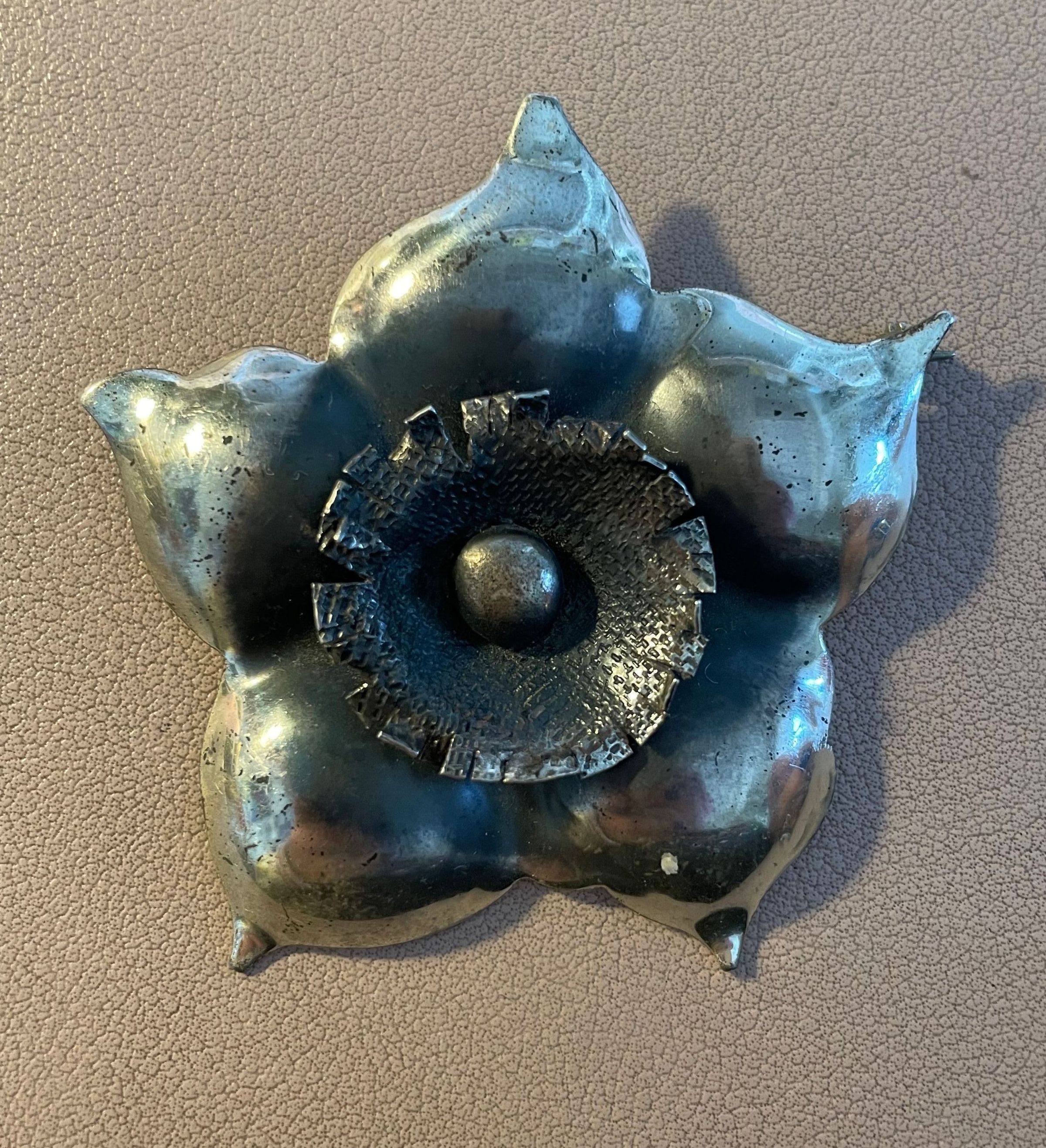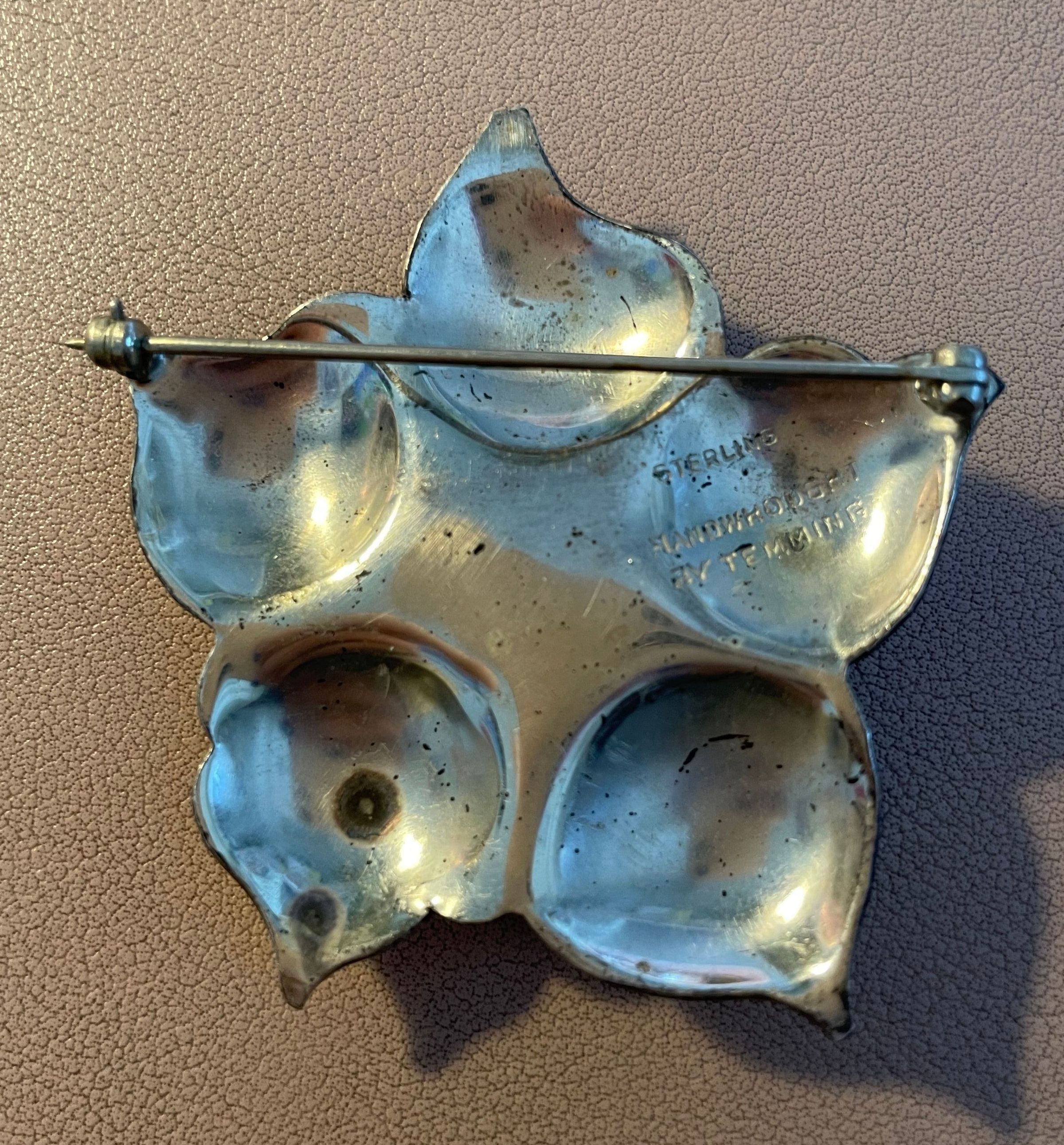 Silver five-petal flower pin with bar backing. Stamped, "Sterling, Handwrought by Temming," on reverse. The center of the flower is textured, and the flower petals are tarnished behind it.