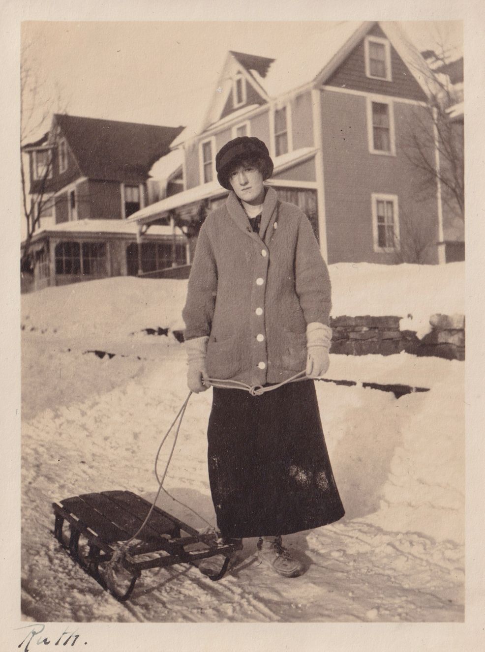 Black-and-white photograph of a woman standing on a snow-covered road with the rope attached to a toboggan in her hands. There are cure cottages behind her. "Ruth" is written in ink at the bottom of the photograph.