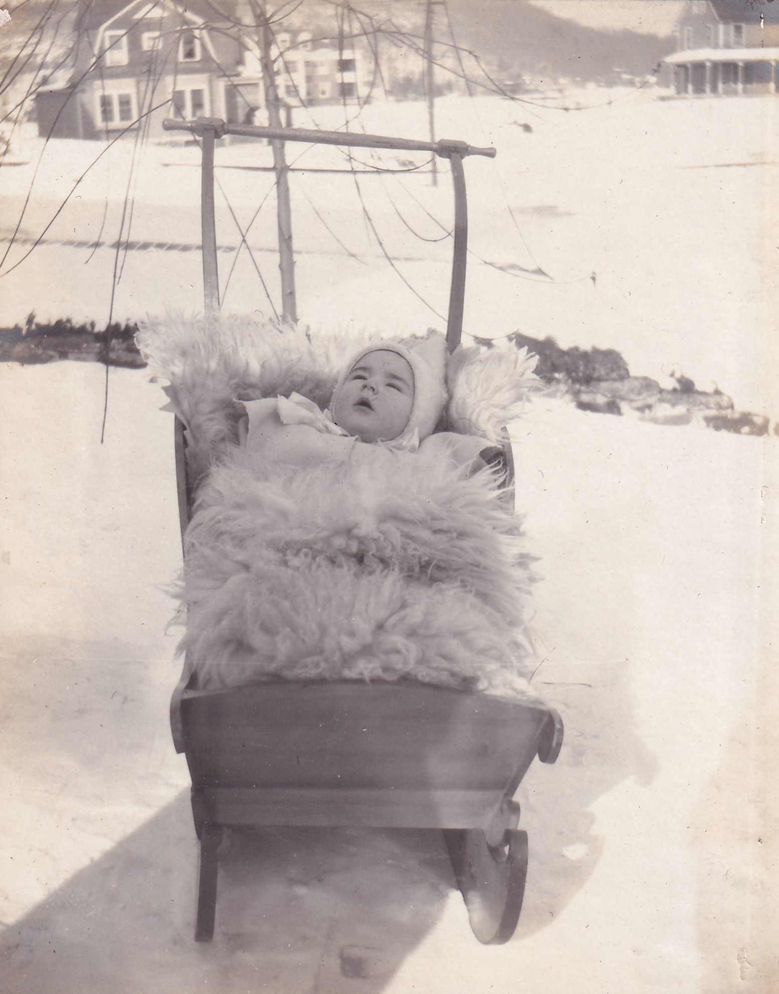 Photograph of an infant John Dean Carrier swaddled in sheepskin in small wooden sleigh. The sleigh is outfitted with a handle and push bar. The Prescott House and several houses on Franklin Avenue can be seen in the distance. The photograph was likely taken from the front lawn of 33 Franklin Avenue [79].