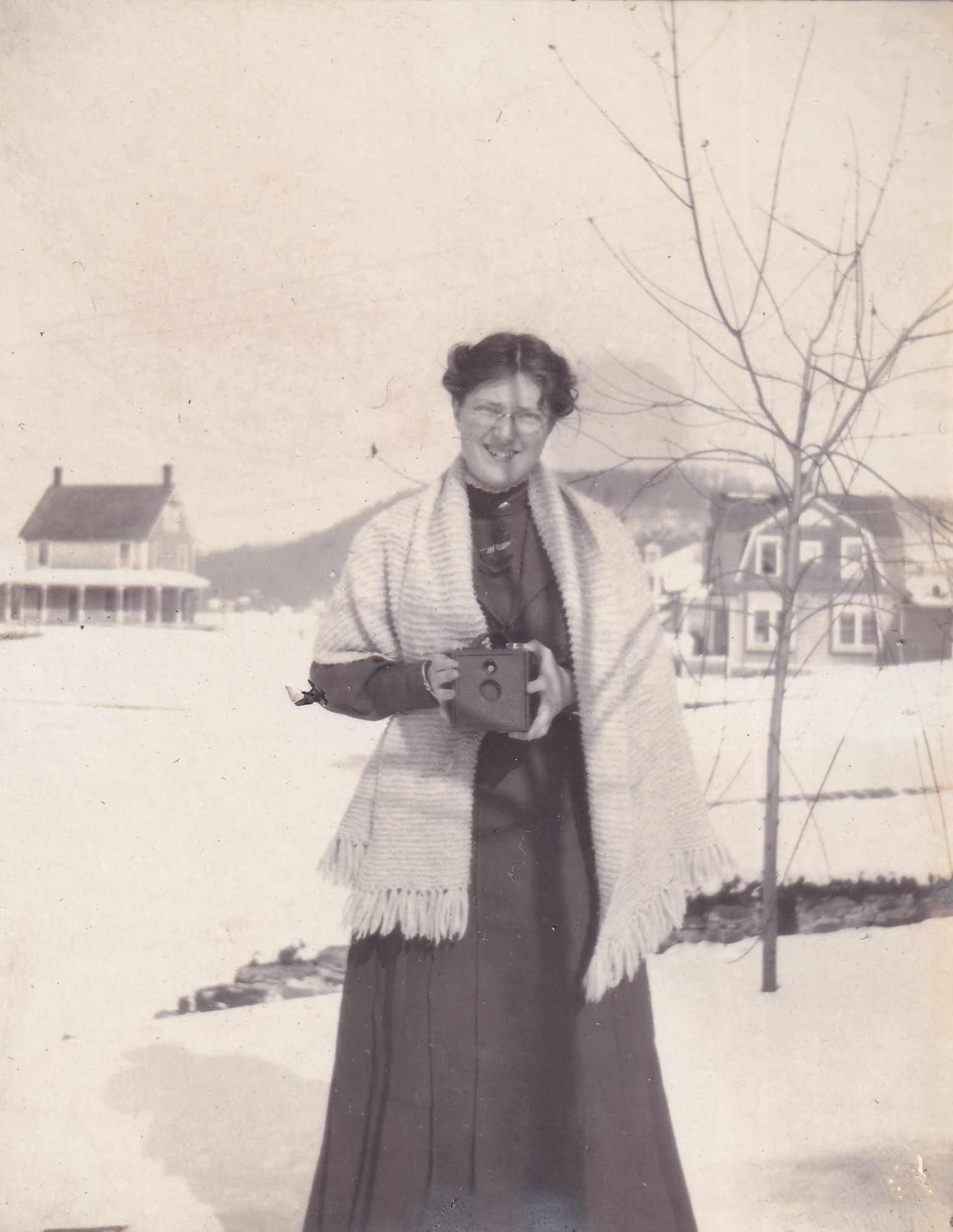 Photograph of Blanche Smith standing outdoors. She is looking at the camera and holding a box camera pointed at the photographer. Unidentified houses on Franklin Avenue and possibly Park Place [Prescott Place] or Shepard Avenue can be seen behind her. Handwritten note on page reads, "Blanch [sic]."Photograph Details