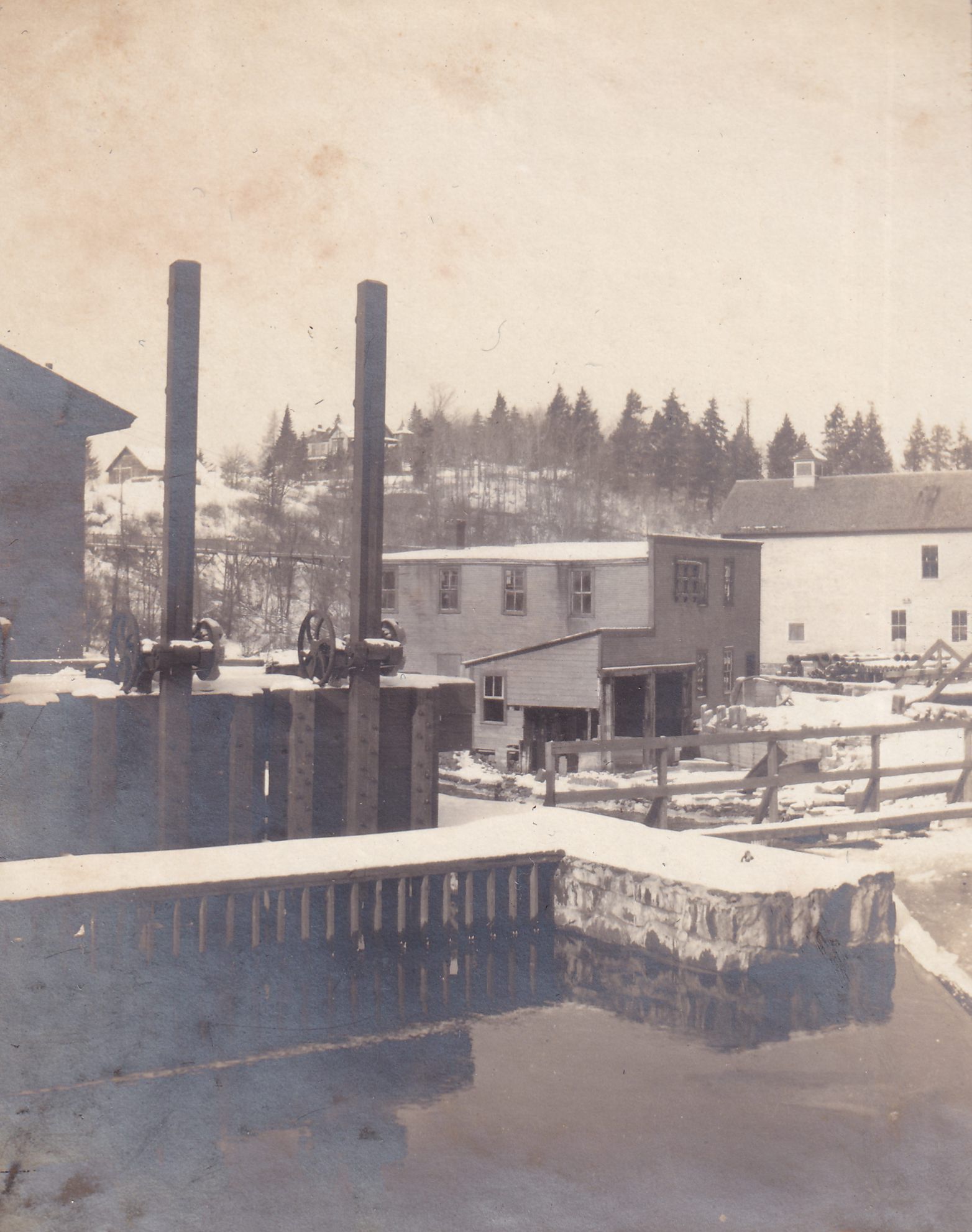 Photograph of the Lake Flower dam in the snow, with the village's first electric plant visible at left. Adirondack Bottling is visible in the background.