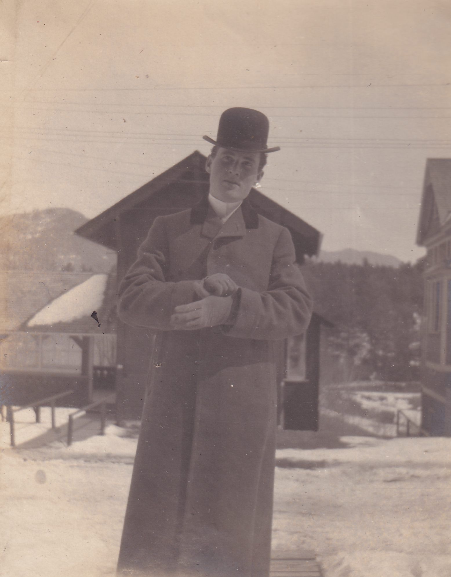 Photograph of an unidentified man wearing a long coat, gloves, and bowler hat. He is standing in front of 32 Franklin Avenue [84], and the side of 34 Franklin Avenue [80] is just visible at right.Photograph Details