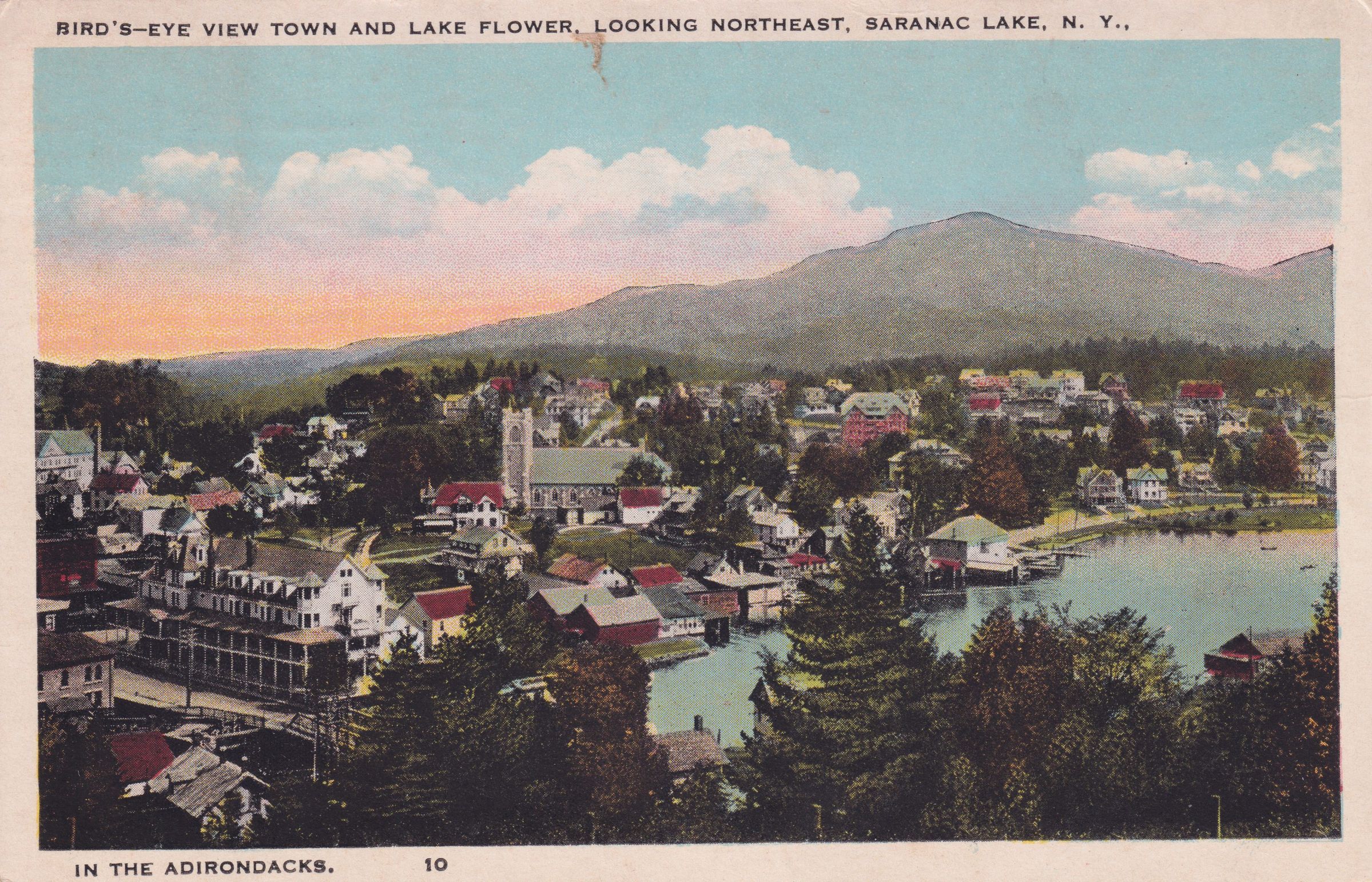 Color postcard of the village of Saranac Lake from Blood/Lake Street Hill showing a portion of Lake Flower. The Riverside Inn, Methodist Church, the Santanoni, and other buildings are visible. Used, divided back, white border, postmarked July 6, 1925, Saranac Lake, NY. Caption printed on front reads, "Bird's-eye View Town and Lake Flower, Looking Northeast, Saranac Lake, N.Y. in the Adirondacks." Handwritten message on back reads, "Well--I'm here. I don't know when I'll ever get back, tho'. Write to me and tell Anna to write. I'm not allowed to write letters but I'll answer with post-cards. I've been put to bed for six weeks. isn't that awful? Love, Margaret." Mailed to Mrs. John Stamm, 324 Pine St., Ambridge, Pennsylvania.Subject Place