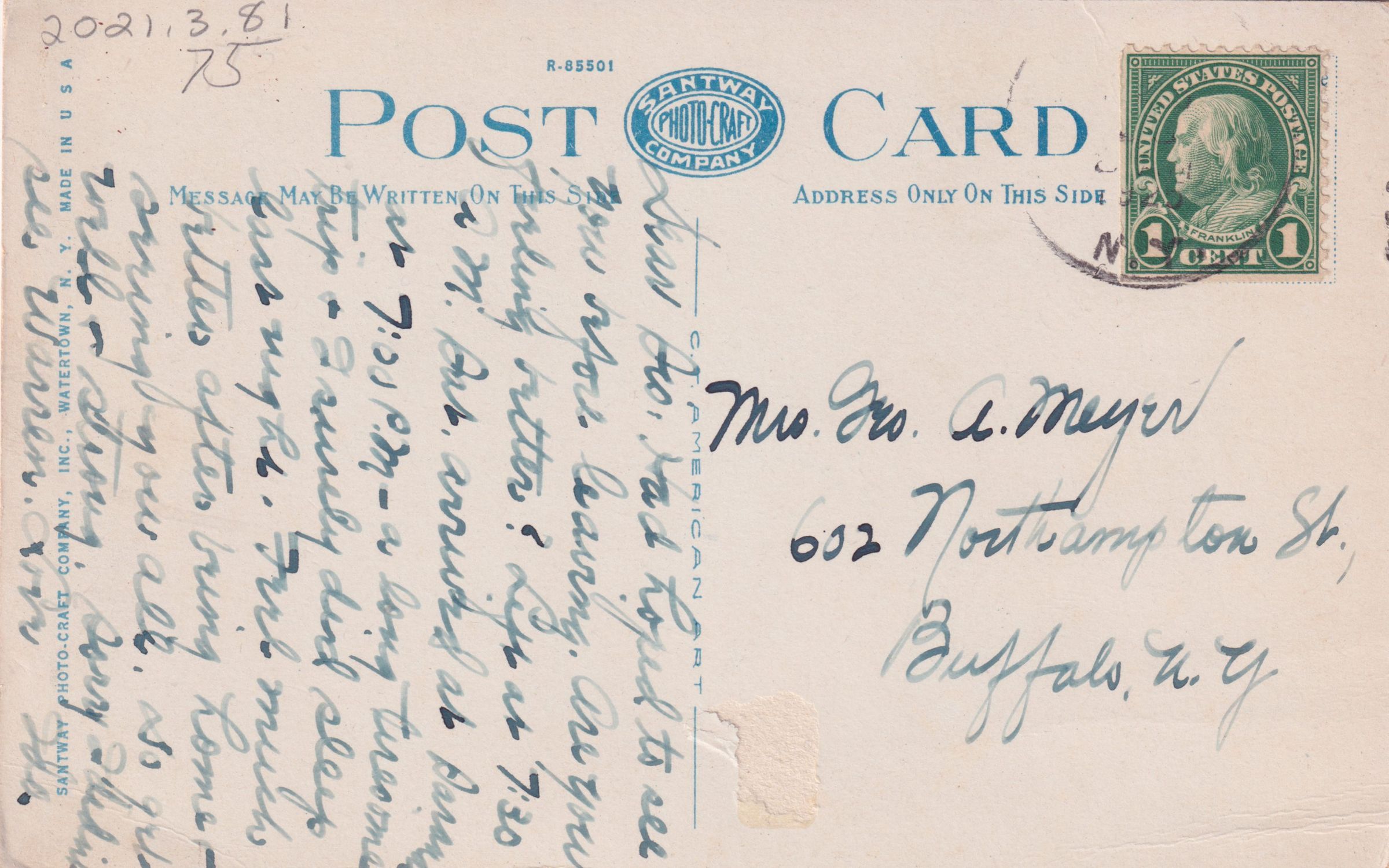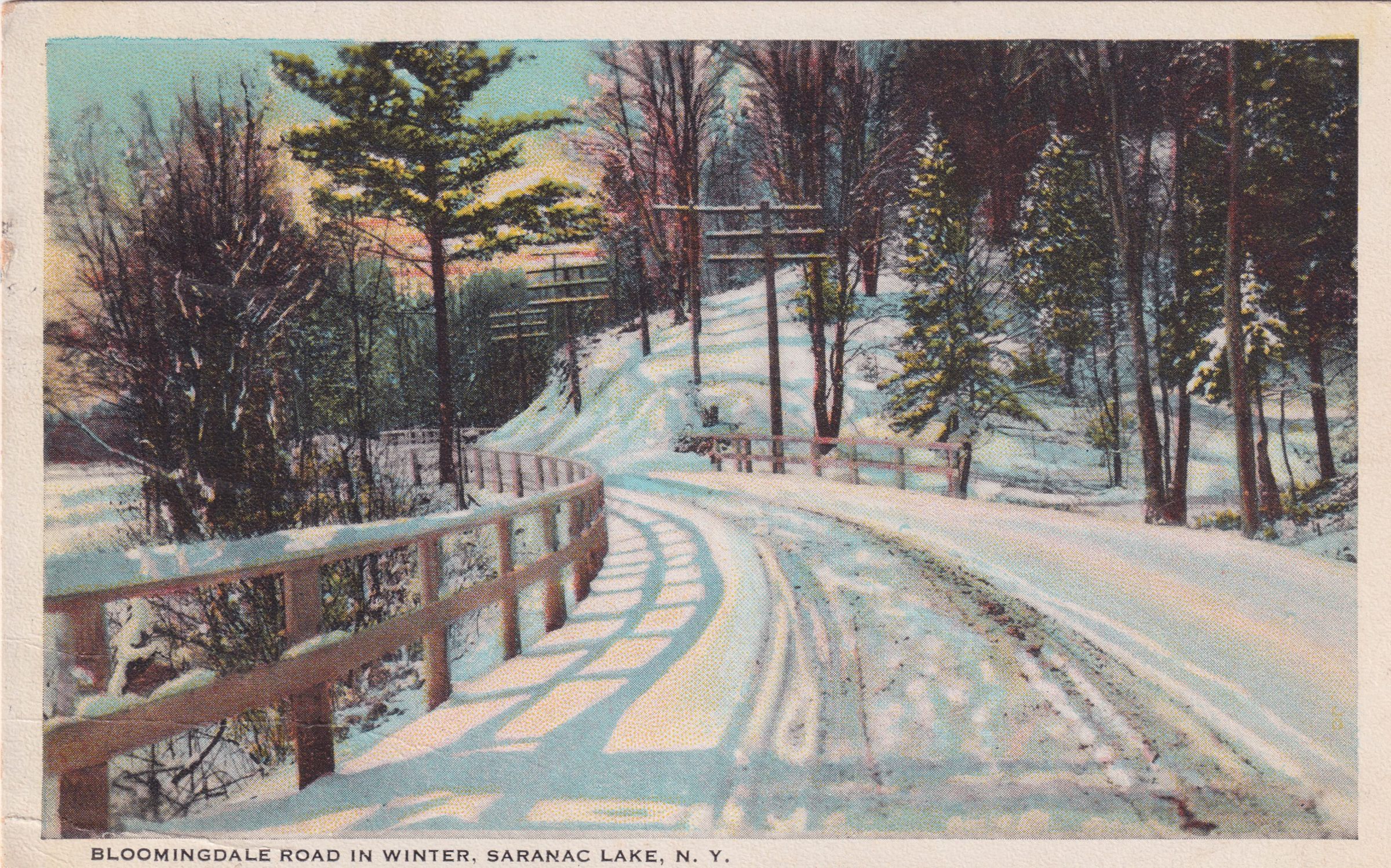 Color postcard showing a snow-covered road. Printed caption on the front reads, "Bloomingdale Road in Winter, Saranac Lake, NY." Used, divided back, postmarked 1925, rest illegible. Printed by the Santway Photo-Craft Company, Watertown, NY. Handwritten message on the back reads, "Dear Sis - Had hoped to see you before leaving. Are you feeling better? Left at 7:30 AM Sat. arrived at Saranac at 7 PM - a long tiresome trip and I surely did sleep last night. Feel much better after being home, seeing you all So get well and strong. Sorry I didn't see Warren. Love, Ida." Mailed to Mrs. Geo. A. Meyer, 602 Northampton St., Buffalo, NY.Collection