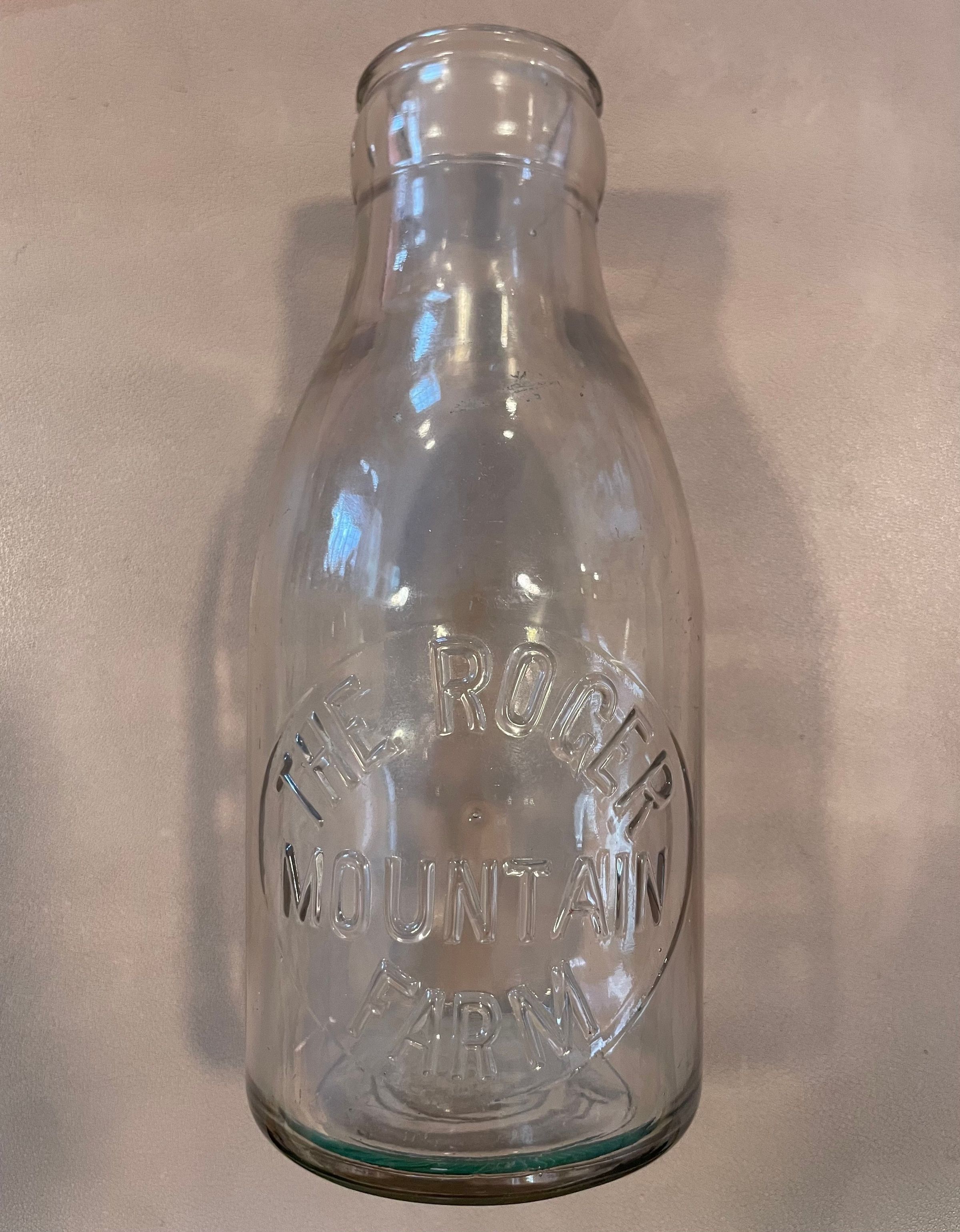 Clear glass milk bottle (1 pint) from the Roger Mountain Farm, Ray Brook, NY.